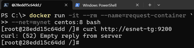 원래는 이 상황에서 네트워크 별칭인 http://esnet-tg:9200을 수행하면 접속이 되어야 하는데..