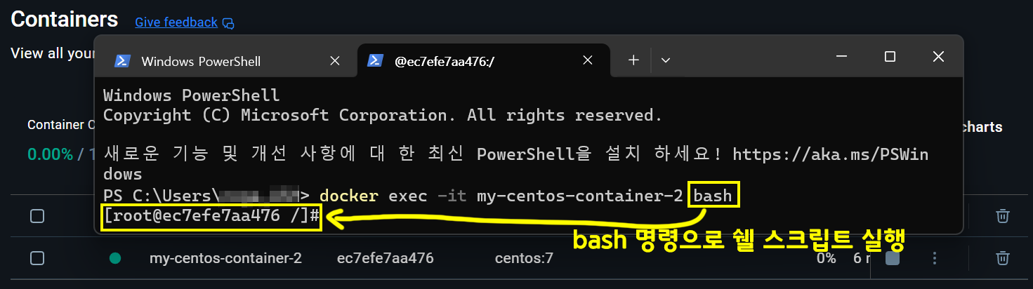 docker run -it --name=my-centos-container-1 centos:7 bash