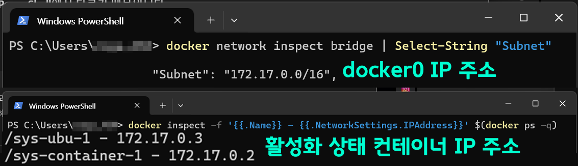 현재 실행중인 다른 컨테이너의 IP Address도 확인이 가능하니 이에 대한 명령어와 실행결과도 같이 첨부한다.