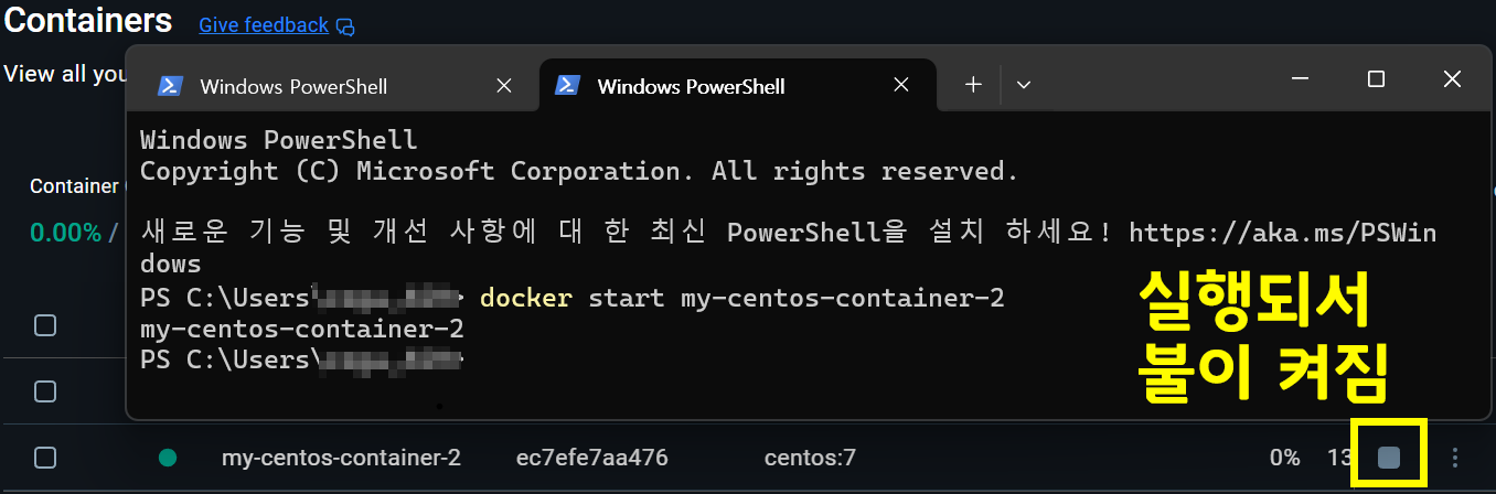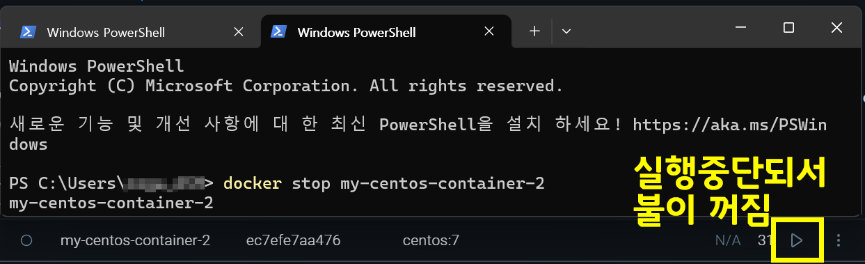 컨테이너 리스트에 등록은 되었으나, 실행중이지 않은 컨테이너를 실행하고 싶을때는
