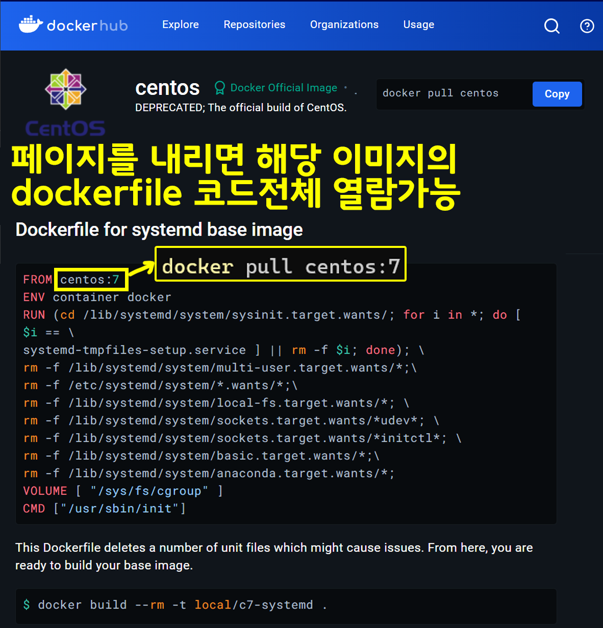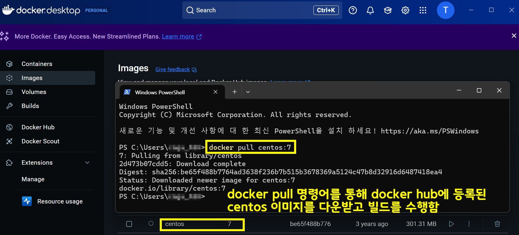 대충 허브에서 도커 이미지가 어떻게 제공되는지 알았으니 아래 이미지처럼 명령어를 입력하여 도커 허브의 이미지를 다운받고 빌드를 실행하자