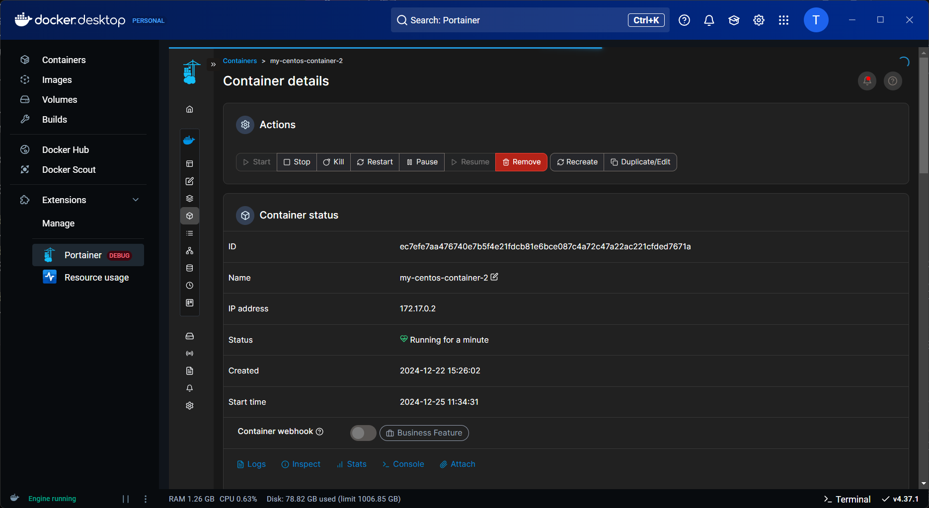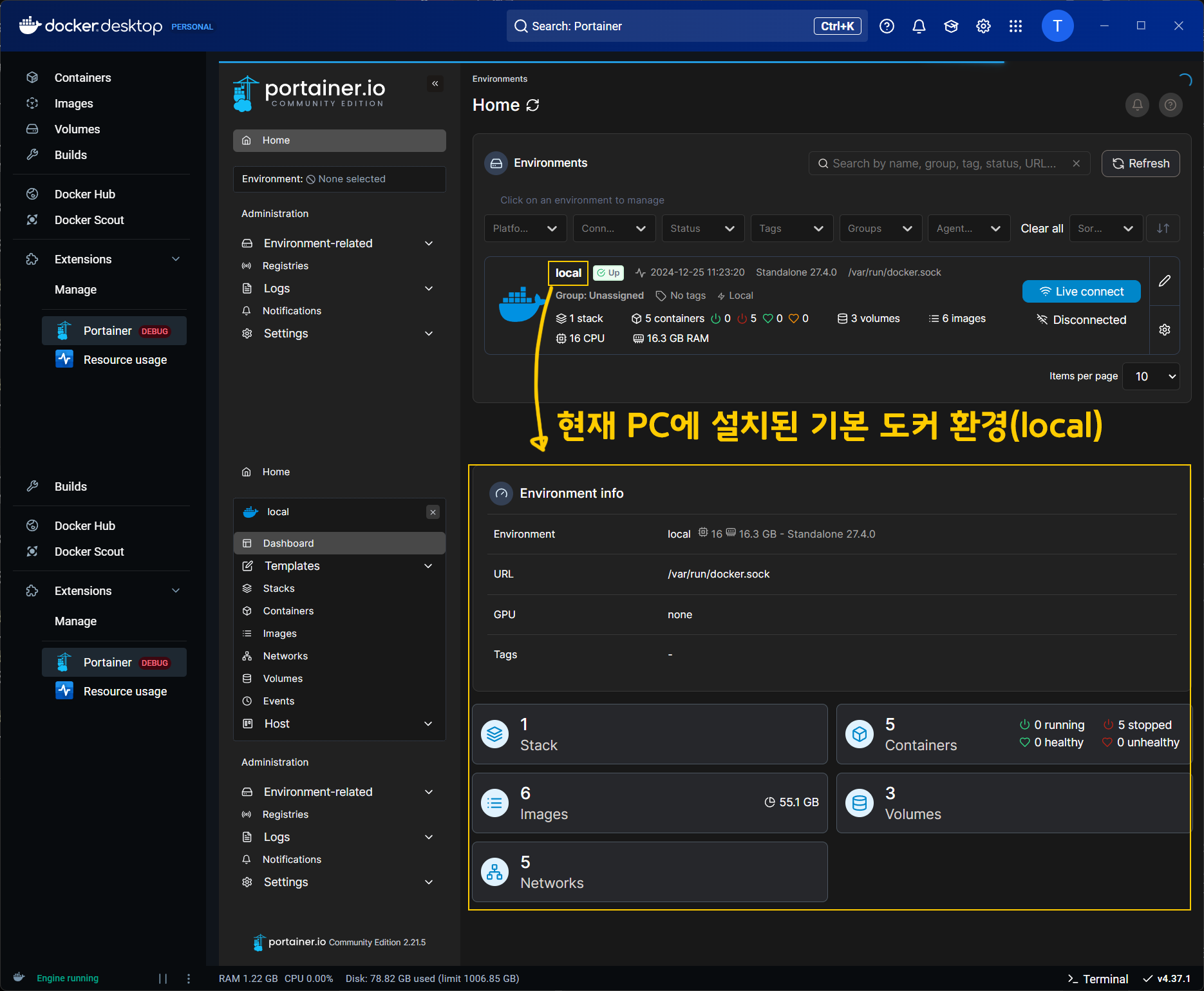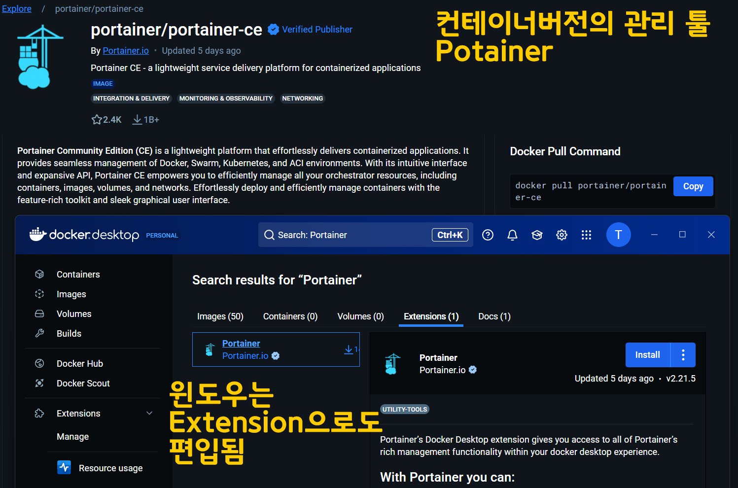 필자의 경우 윈도우 Docker Desktop를 사용해서 설치된 컨테이너의 관리를 GUI방식으로 수행할 수 있지만,