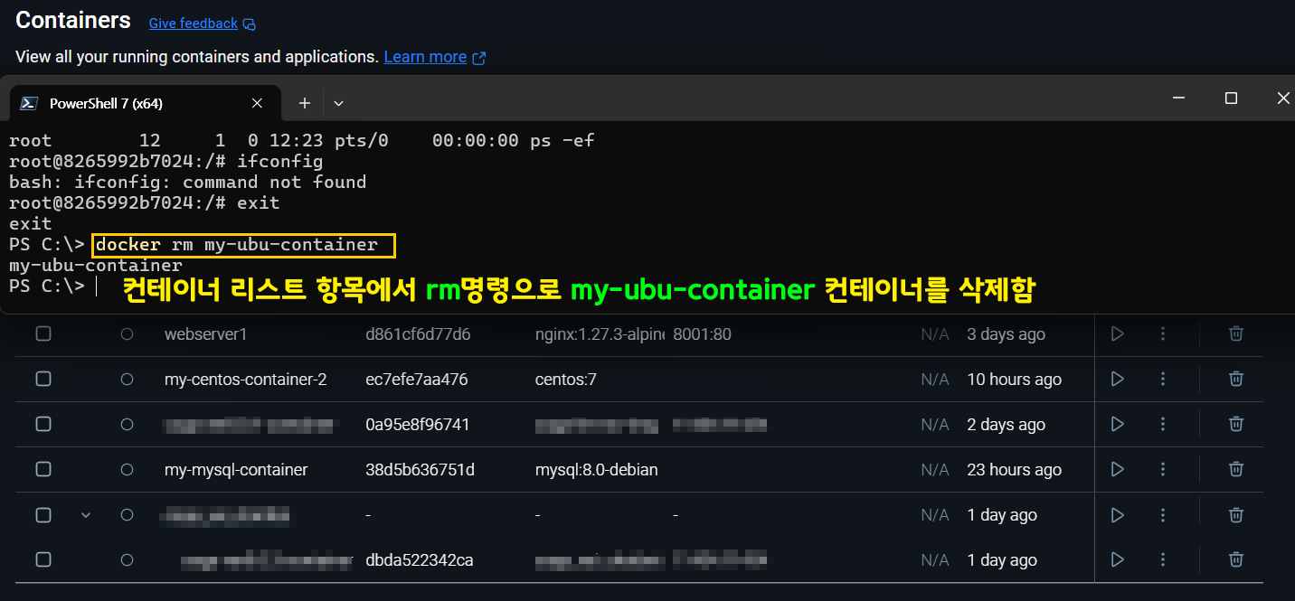 생성한 컨테이너는 아래의 명령어로 삭제가 가능하다