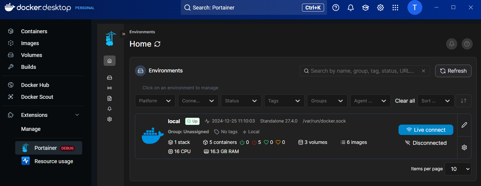 위 구문으로 웹페이지의 http://localhost:9000 접속 시 포테이너를 통한 도커 컨테이너의 전반적인 관리가 가능하다.