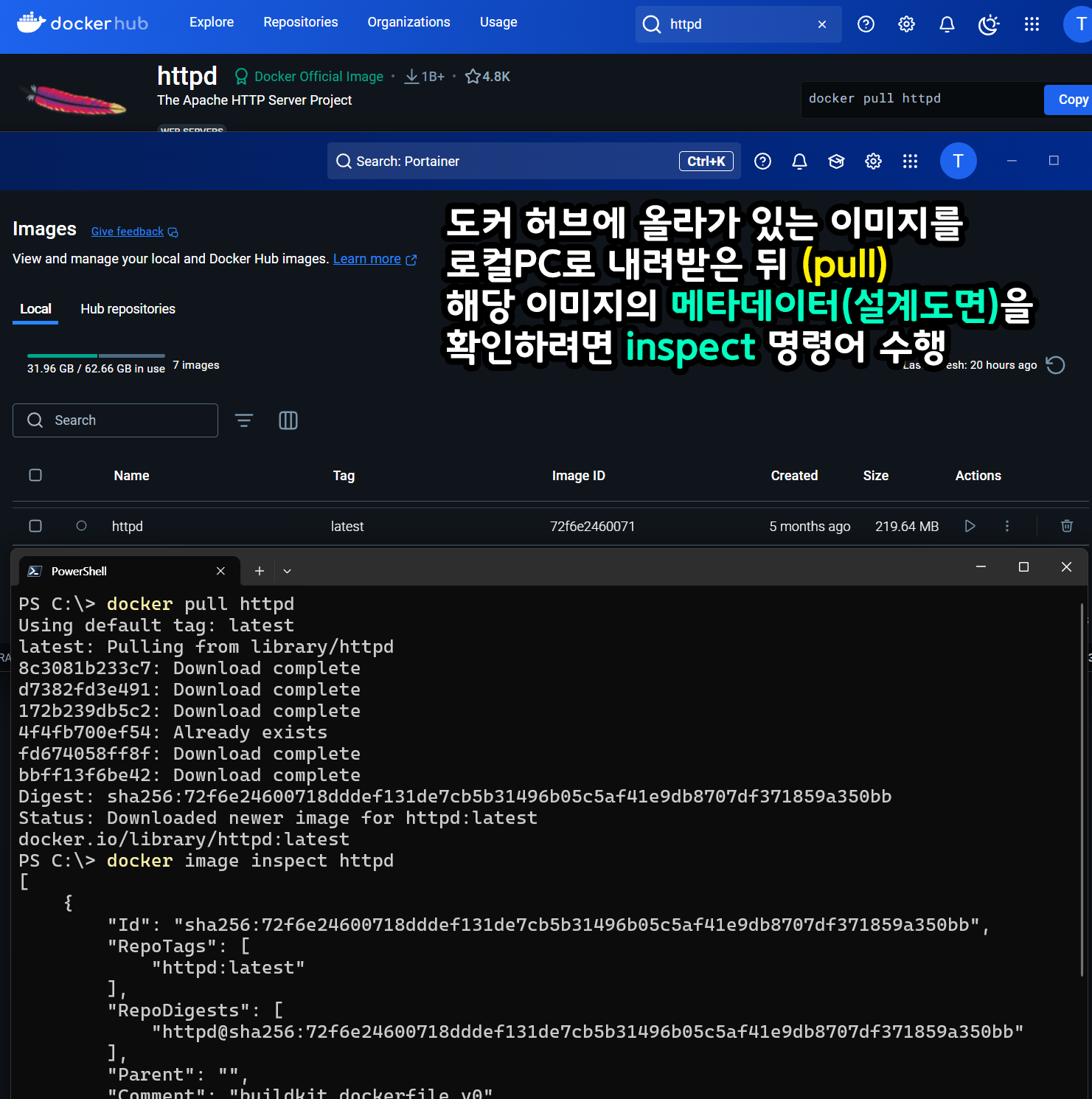 pull을 완료한 뒤에는 inspect명령어로 해당 이미지의 메타데이터(코드구조)를 파악하는 것이 가능하다.