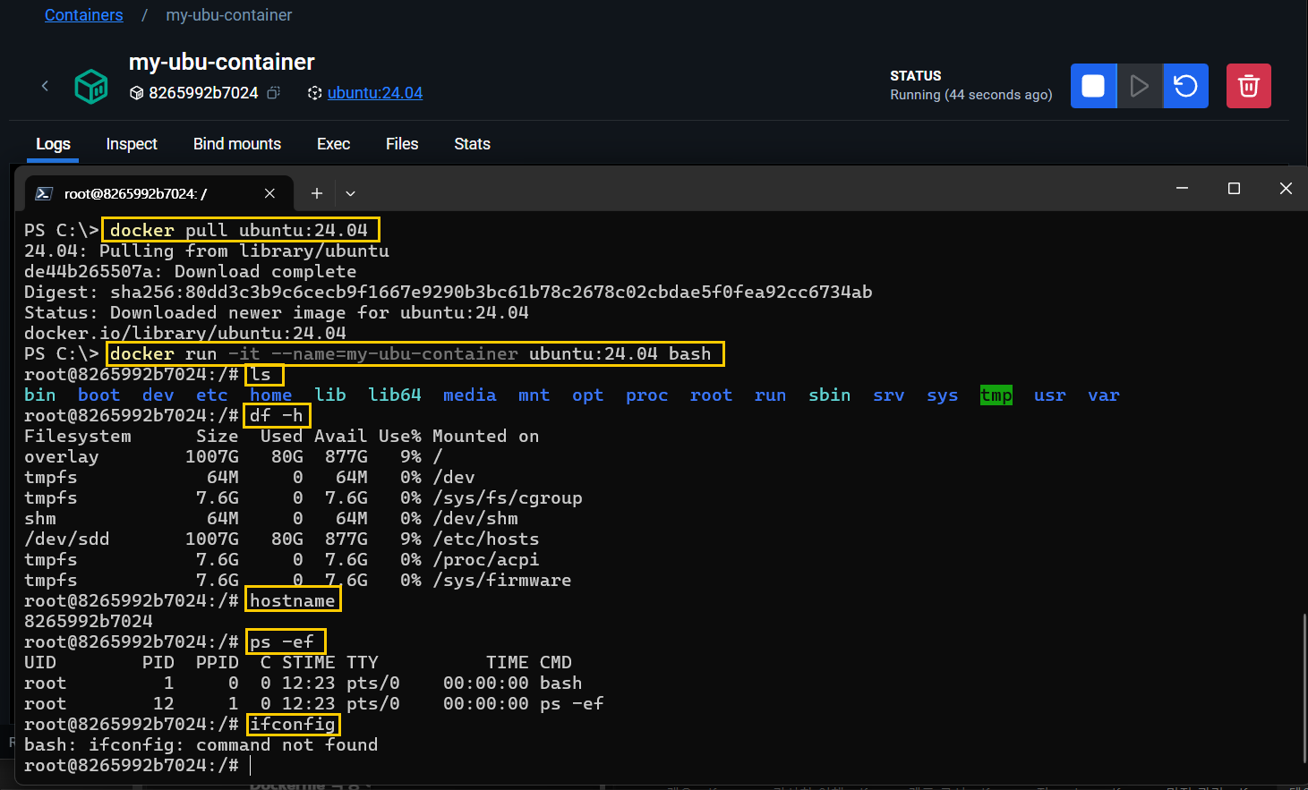 docker run -it --name=my-ubu-container ubuntu:24.04 bash