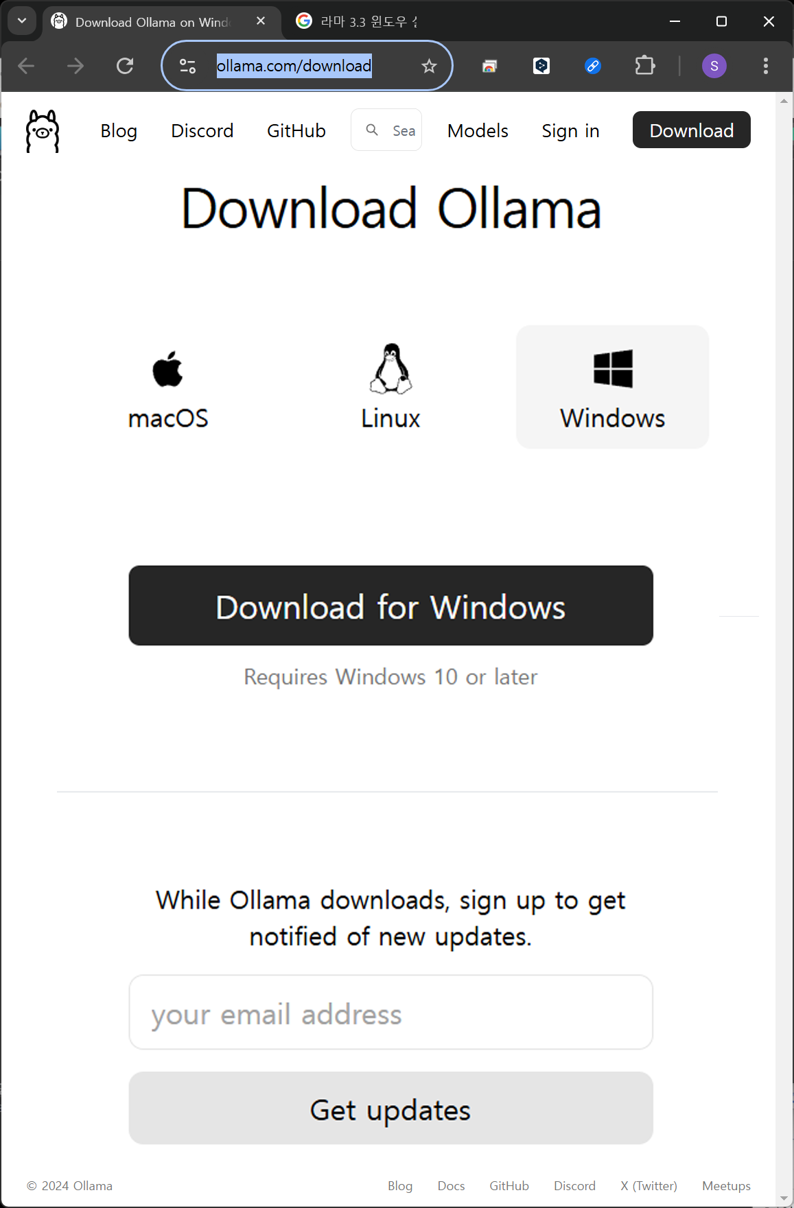 Lamma3을 설치하기 전에 먼저 ollama라는 설치 관리 툴을 설치해야 하는 것으로 보인다.