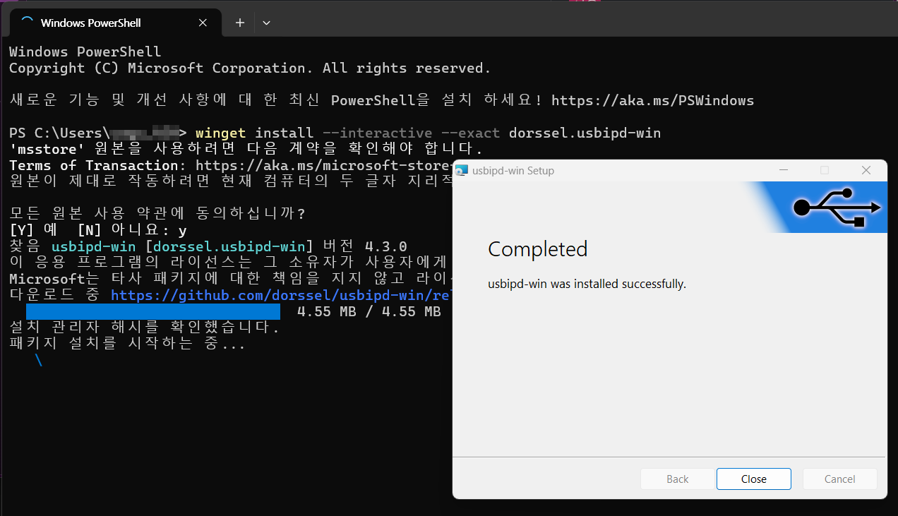 설치를 다 하면 위 사진처럼 usbipd설치 파일이 자동수행된다.