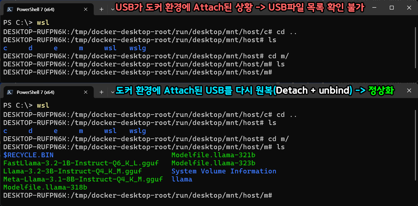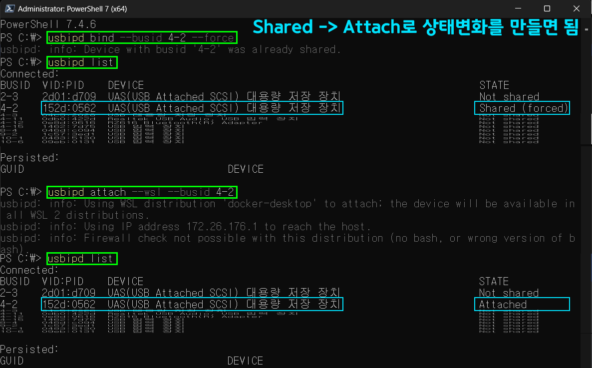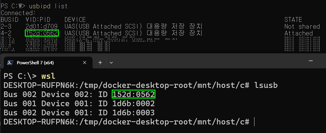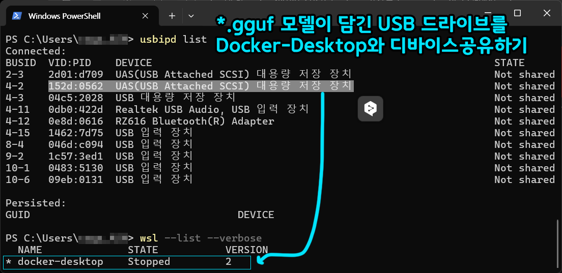 # 공유할 USB를 강제로 wsl 도커 데스크탑에 붙임