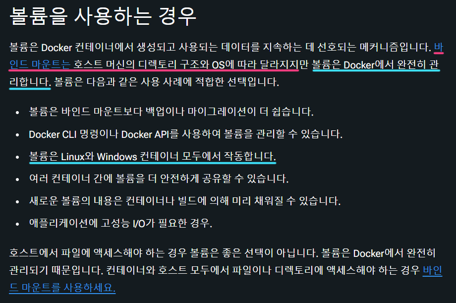 docker 공식문서에서는 괜히 뻘짓거리 하지말고 볼륨 만들어서 쓰라고 나와있다...