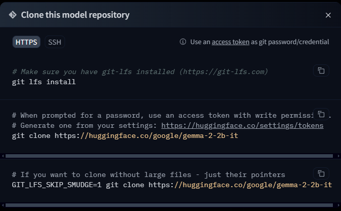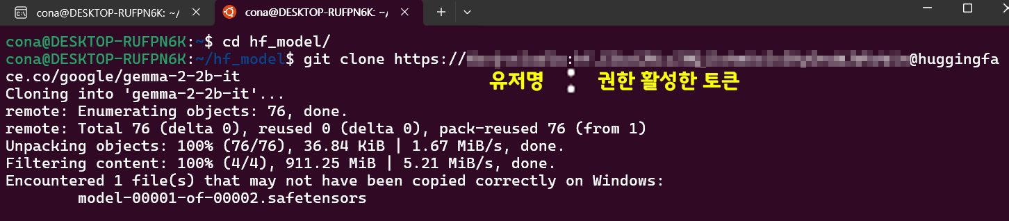 git clone https://<유저명>:<권한 활성화한 토큰>@huggingface.co/google/gemma-2-2b-it