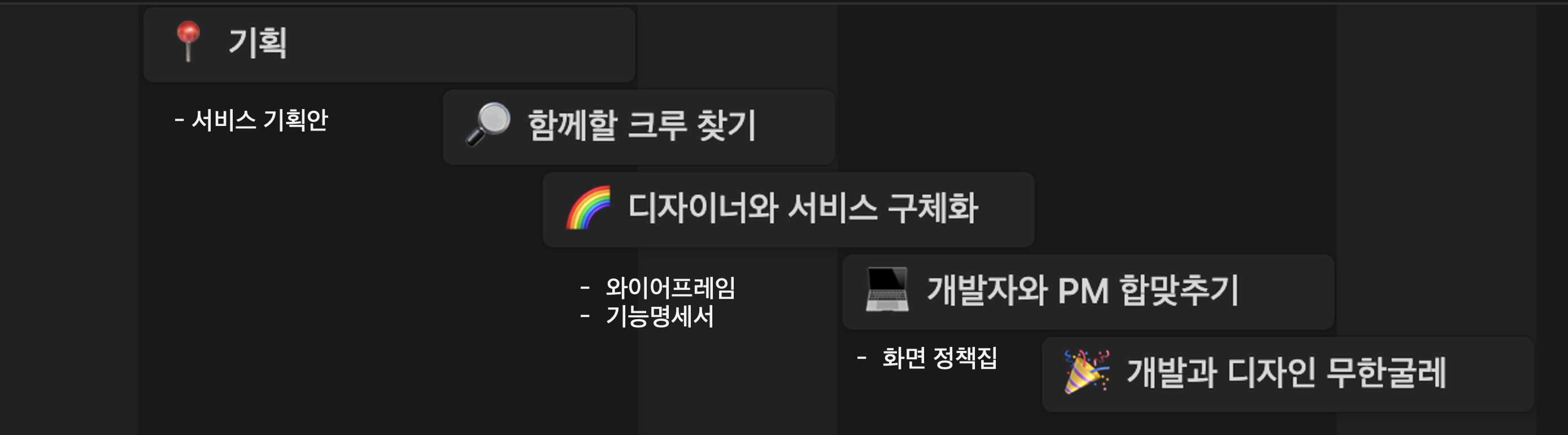 이 뒤, 서비스 기획단계의 디자이너의 업무는 이 아티클 에서 더 디테일하게 확인할 수 있습니다.
