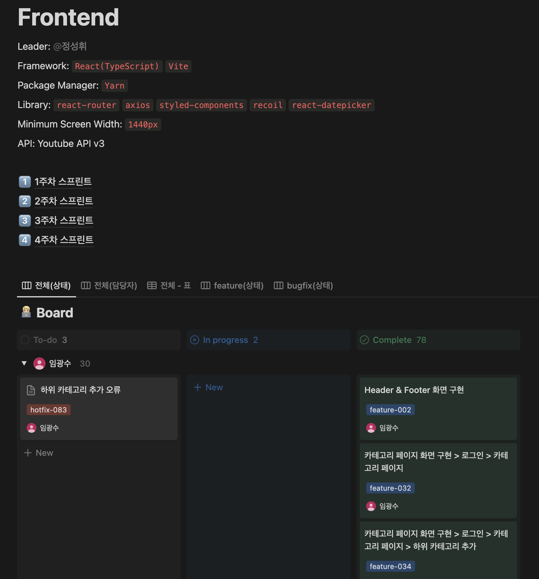 일정관리의 경우에는 노션의 칸반보드를 통해서 개별적으로 스프린트 형식으로 진행상황을 파악했습니다.
