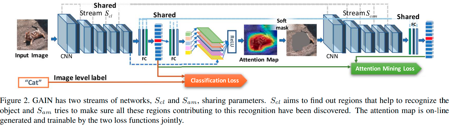 - 이 issue를 해결하기 위해 우리가 제안하는 모델 GAIN은 regularized bootstraping한 방법으로 attention map으로 부터 loss를 구한다.