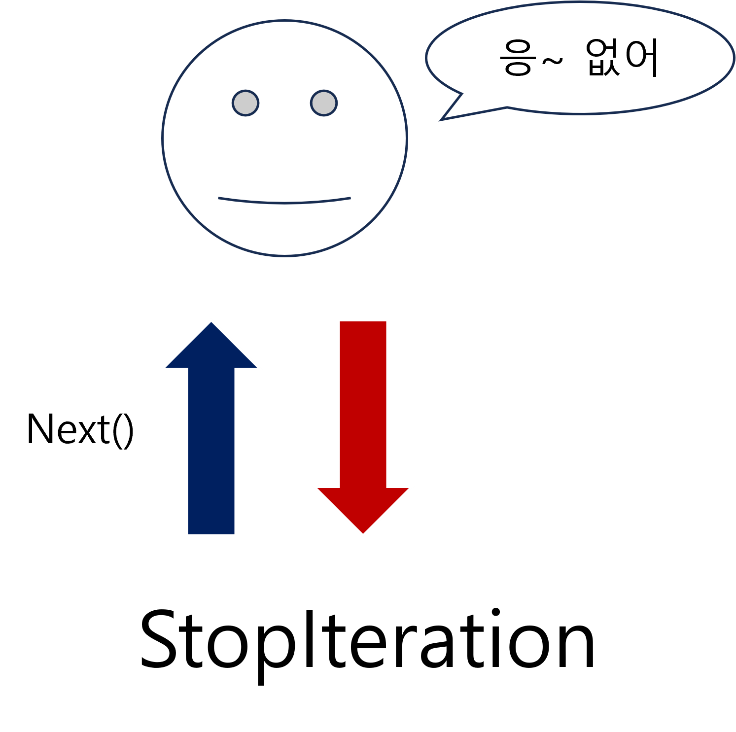 이 과정을 반복하다가 더 이상 다음 값이 없는 순간이 오면 iterator는 StopIteration이라는 예외를 발생시킵니다.