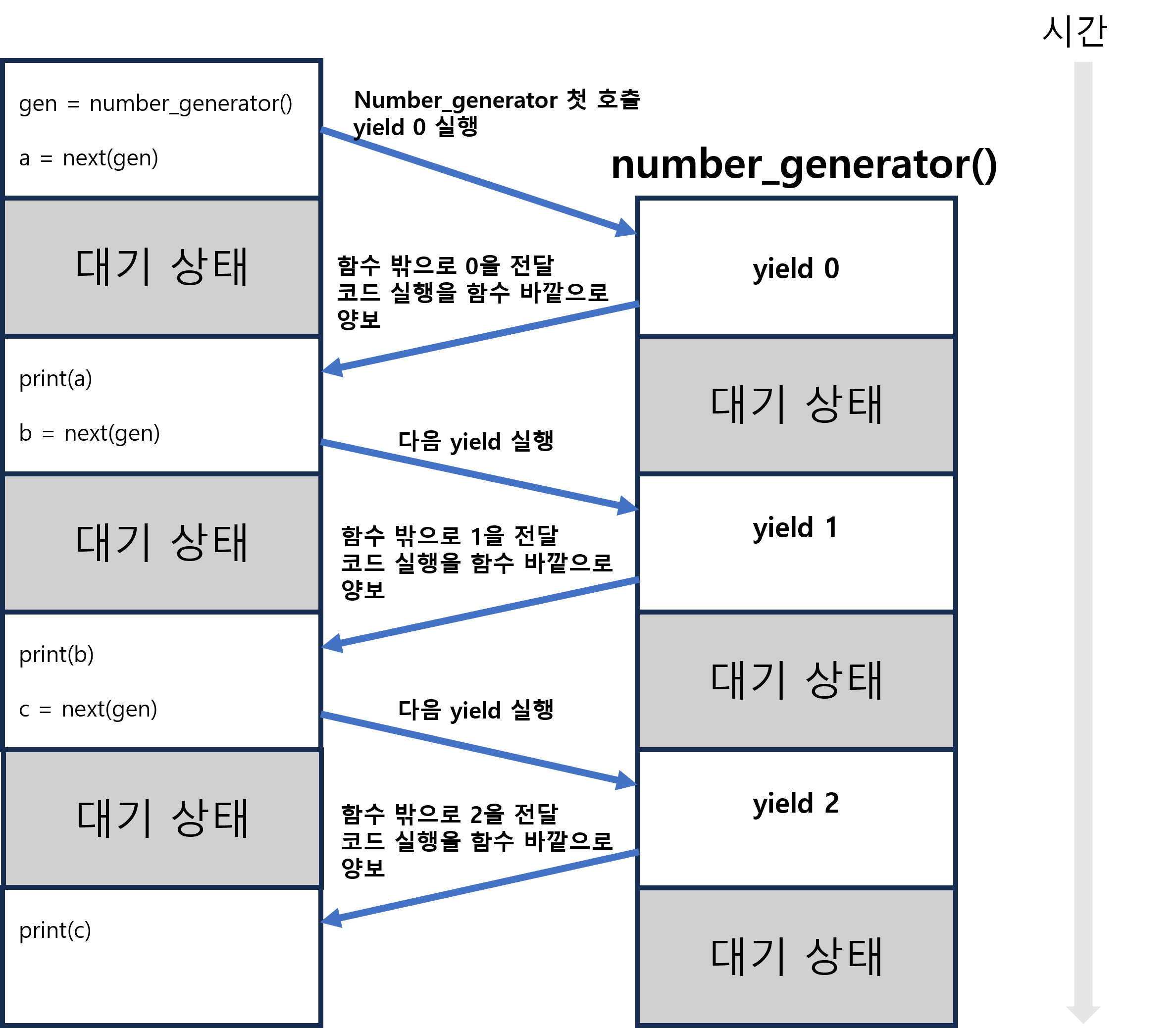 위 그림처럼 next(gen)으로 number_generator함수의 yield를 실행하면 값을 함수의 바깥으로 전달하고 함수는 다음 실행이 있을 때까지 대기상태가 됩니다. 이를 반복하는 것이 yield의 동작과정입니다.