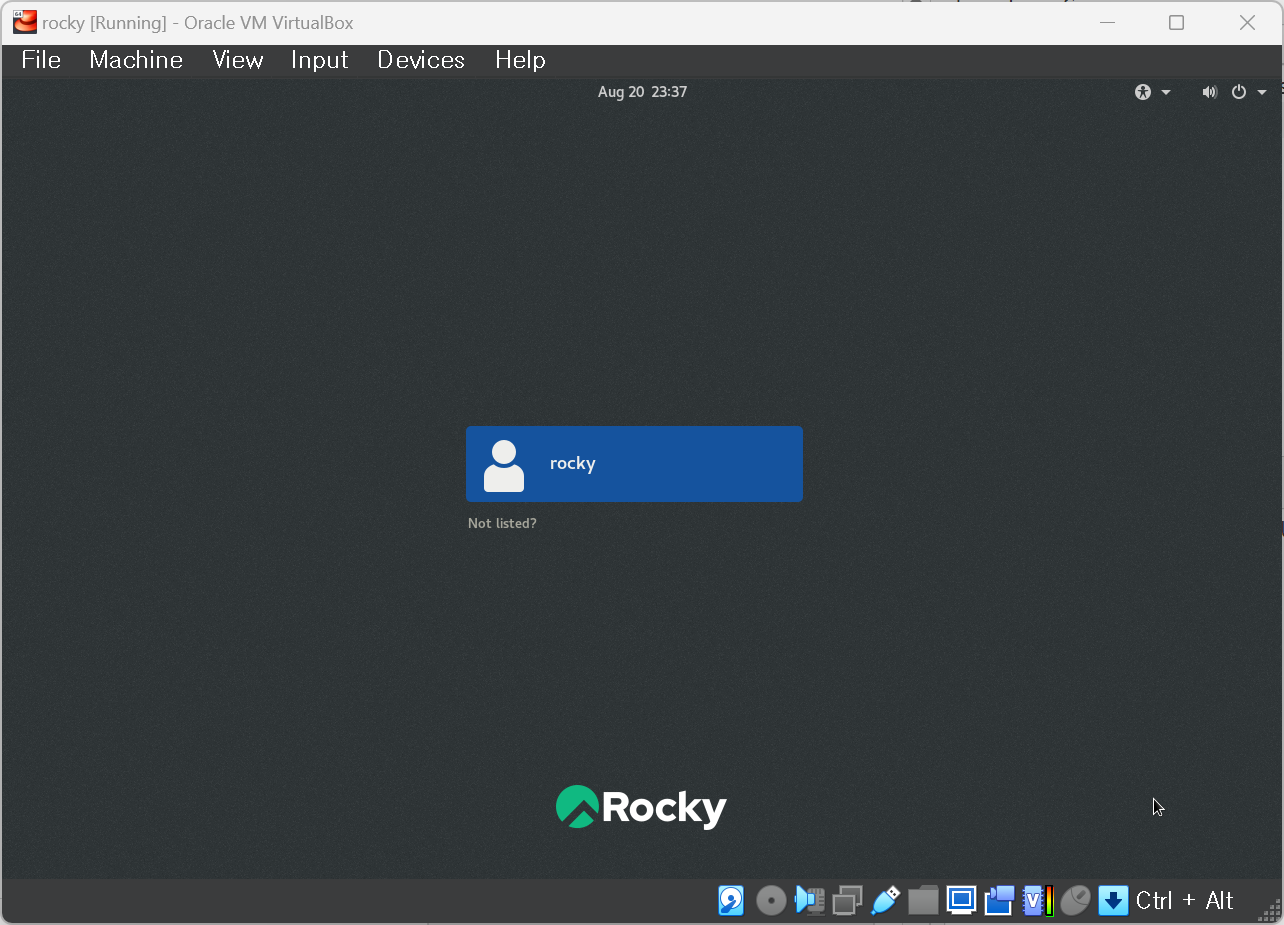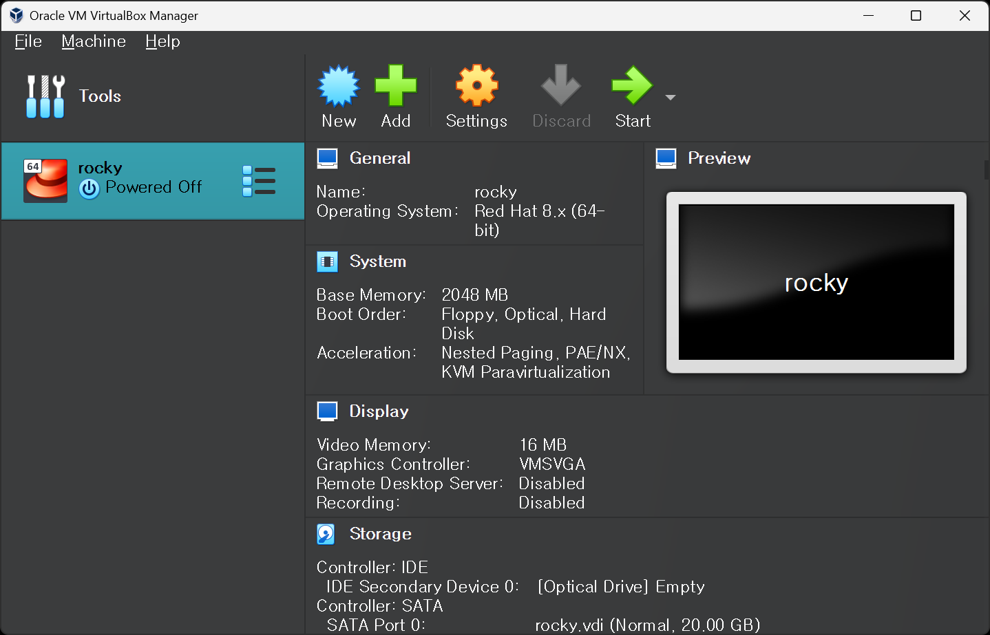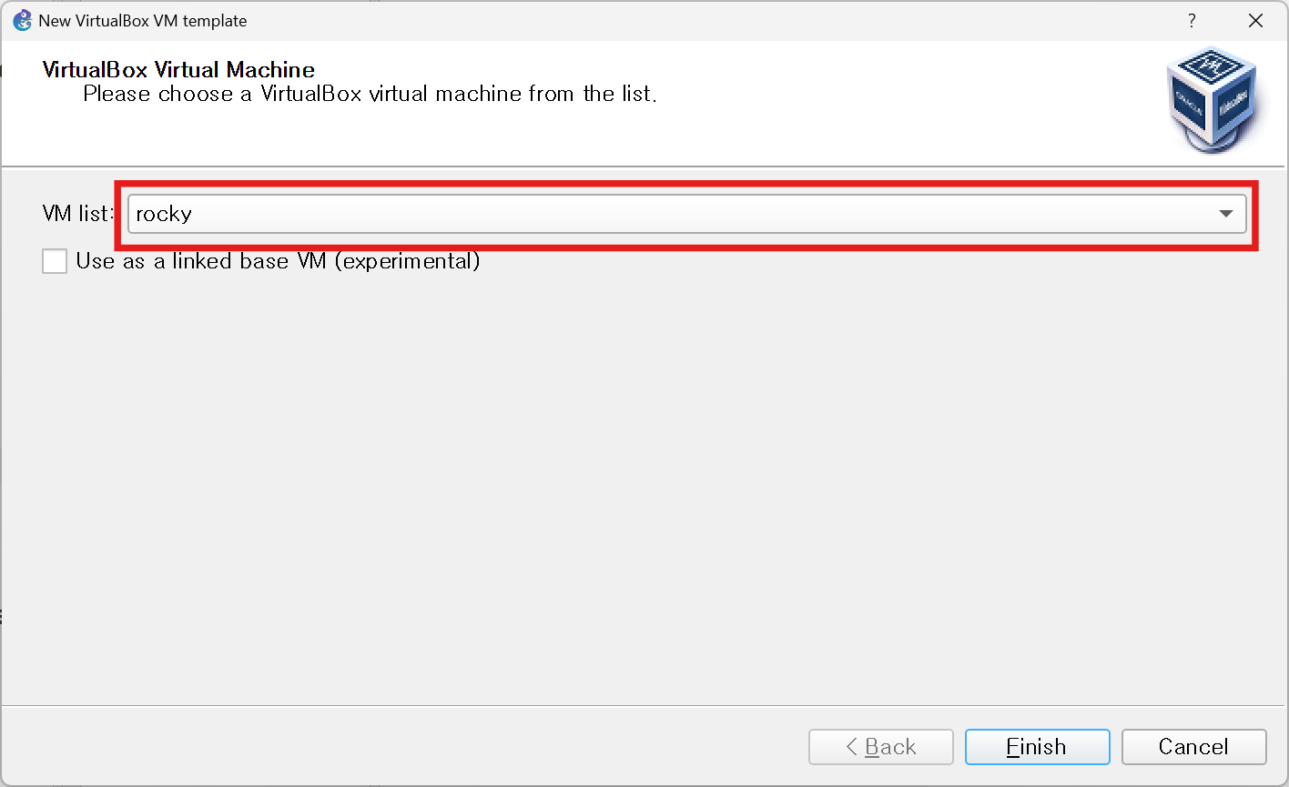 VirtualBox에 만들어둔 Rocky linux 선택후 > Finish