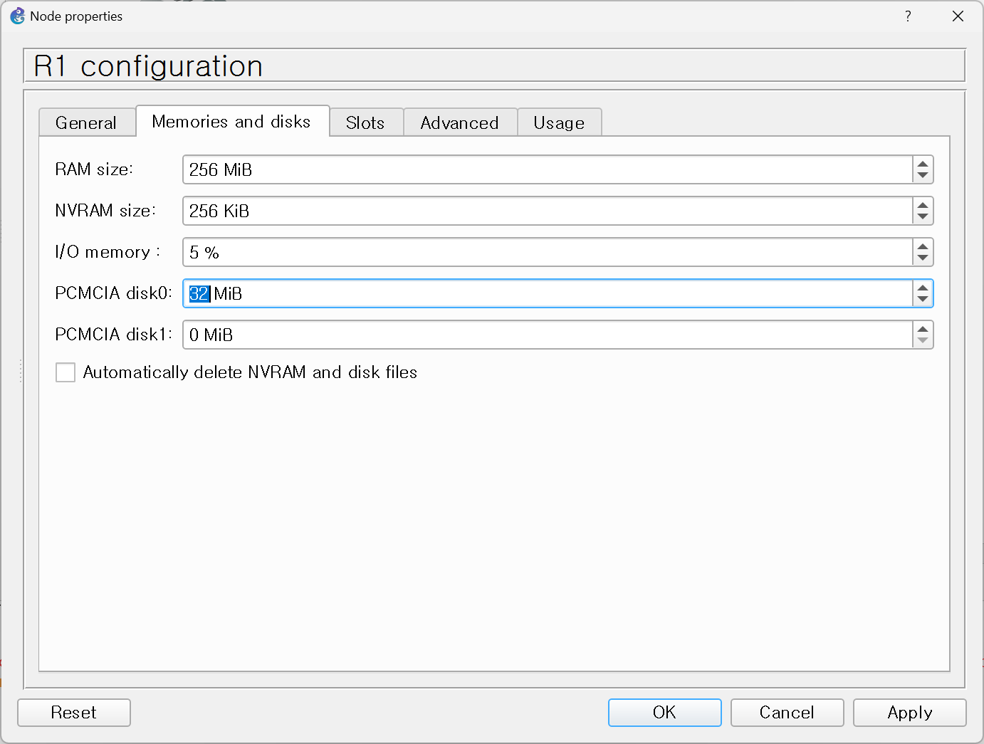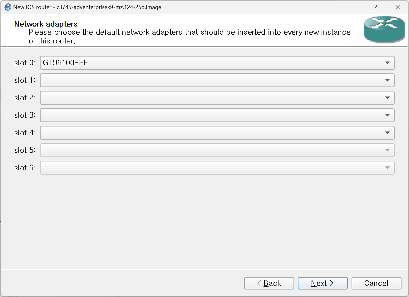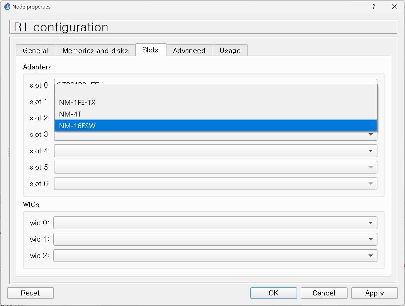 라우터 설정으로 들어가 slot 1의 어뎁터를 NM-16ESW로 바꿔준다