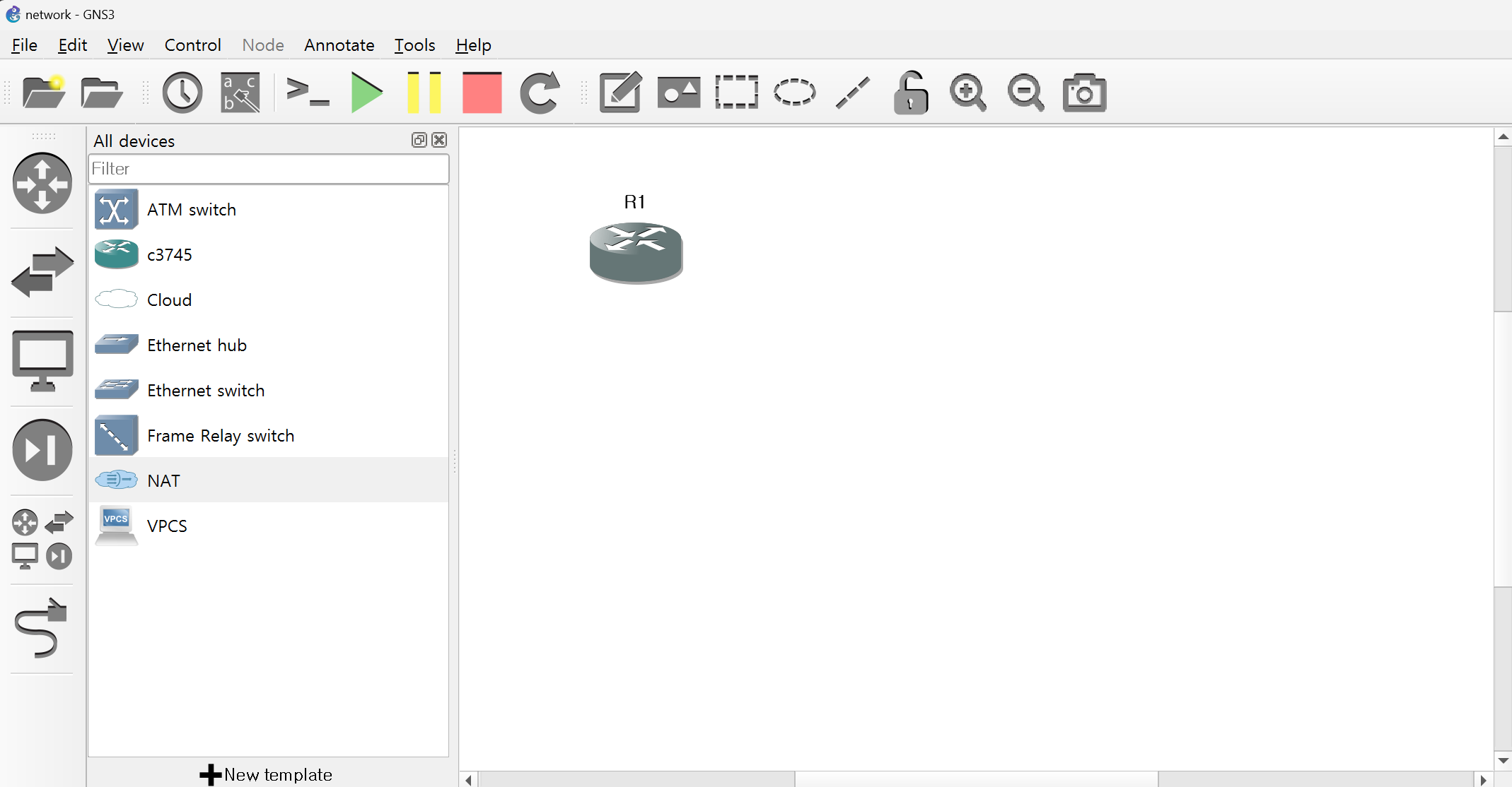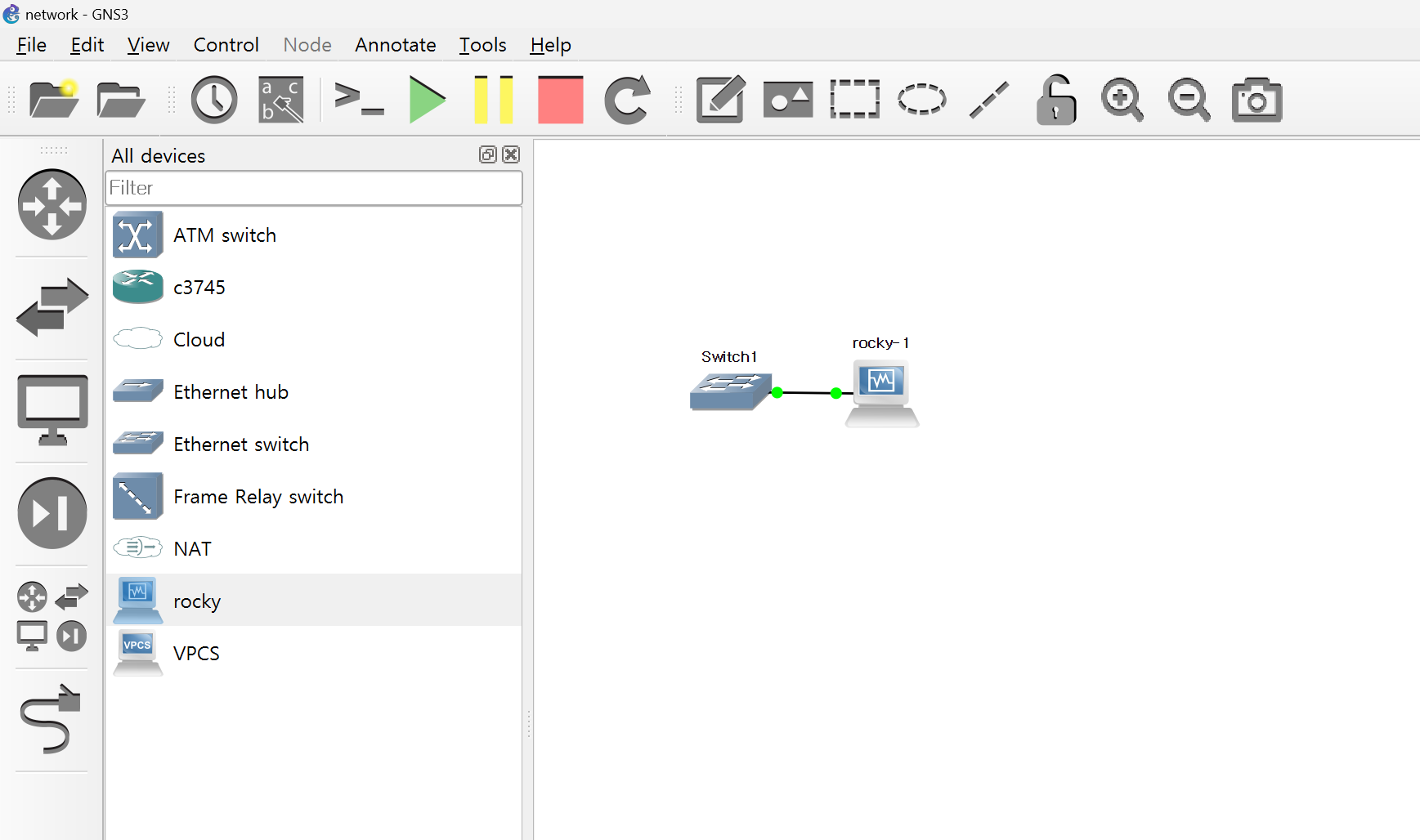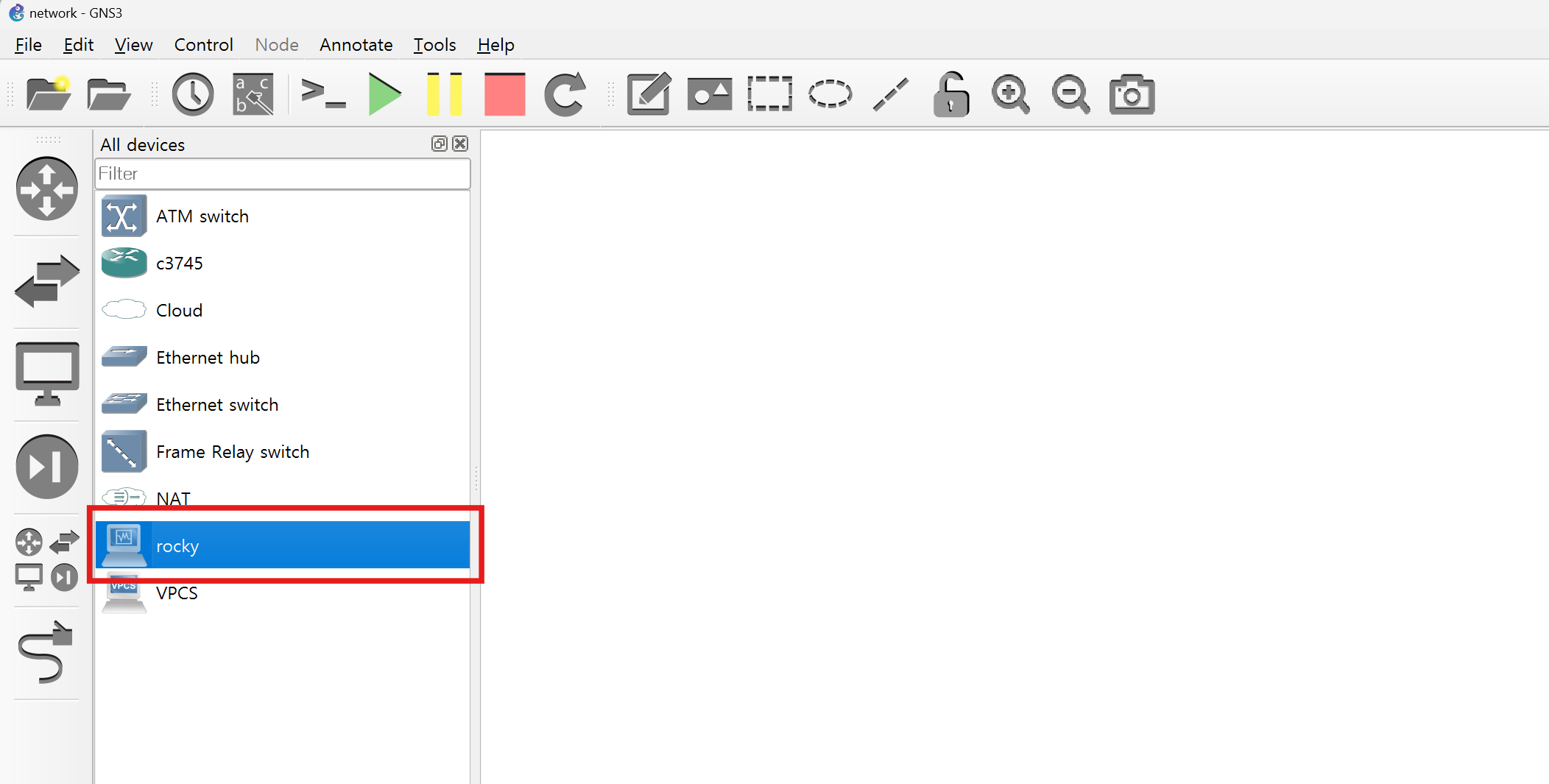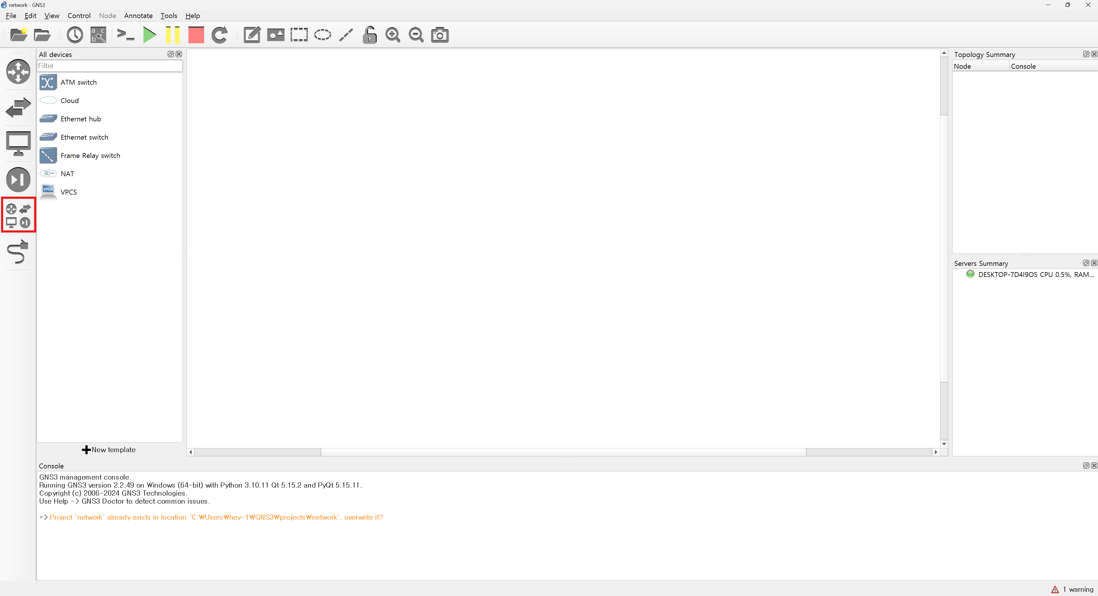 네모박스로 표기한부분을 누르게되면 사용가능한 스위치, 라우터, 가상머신들이 표시된다
