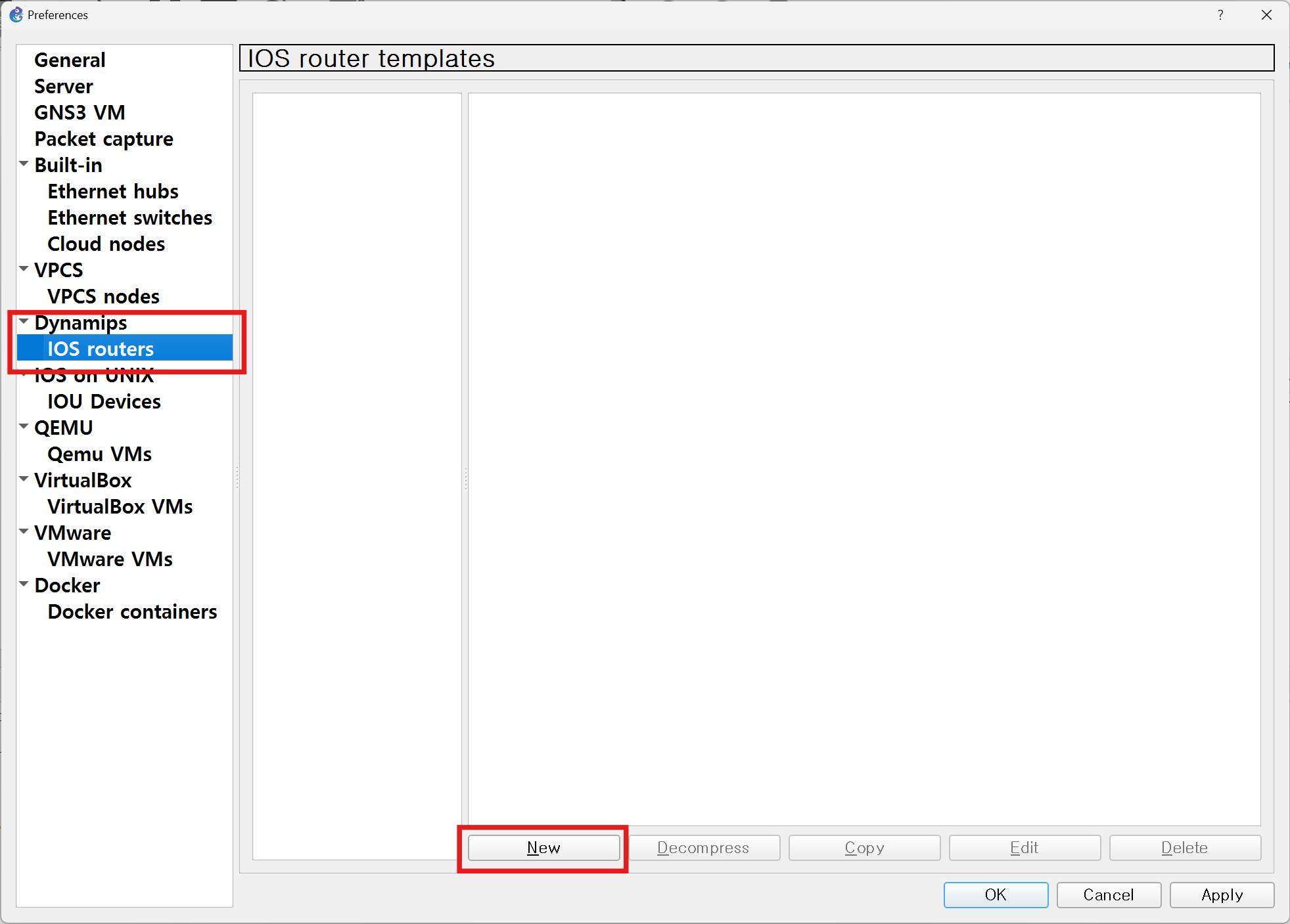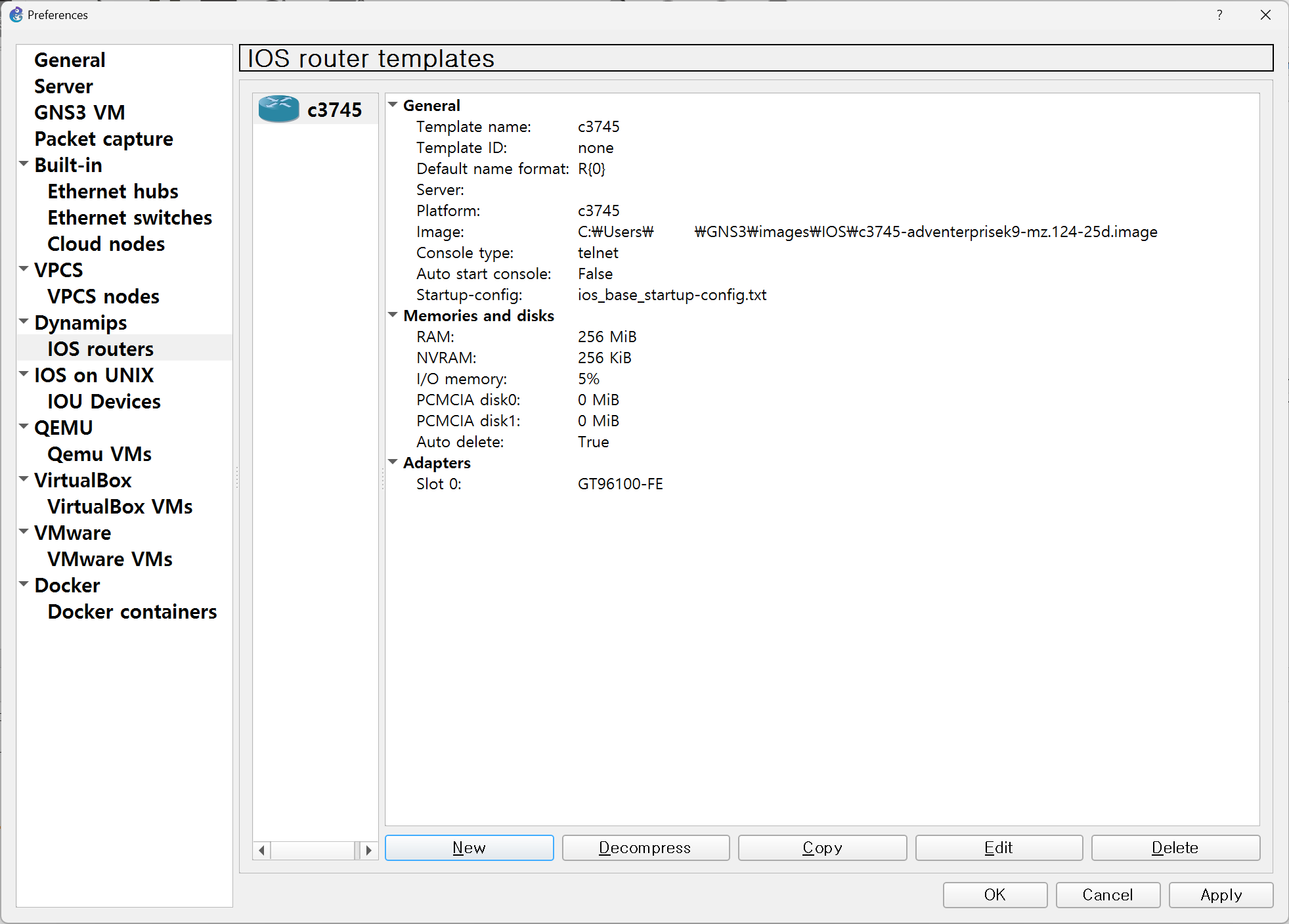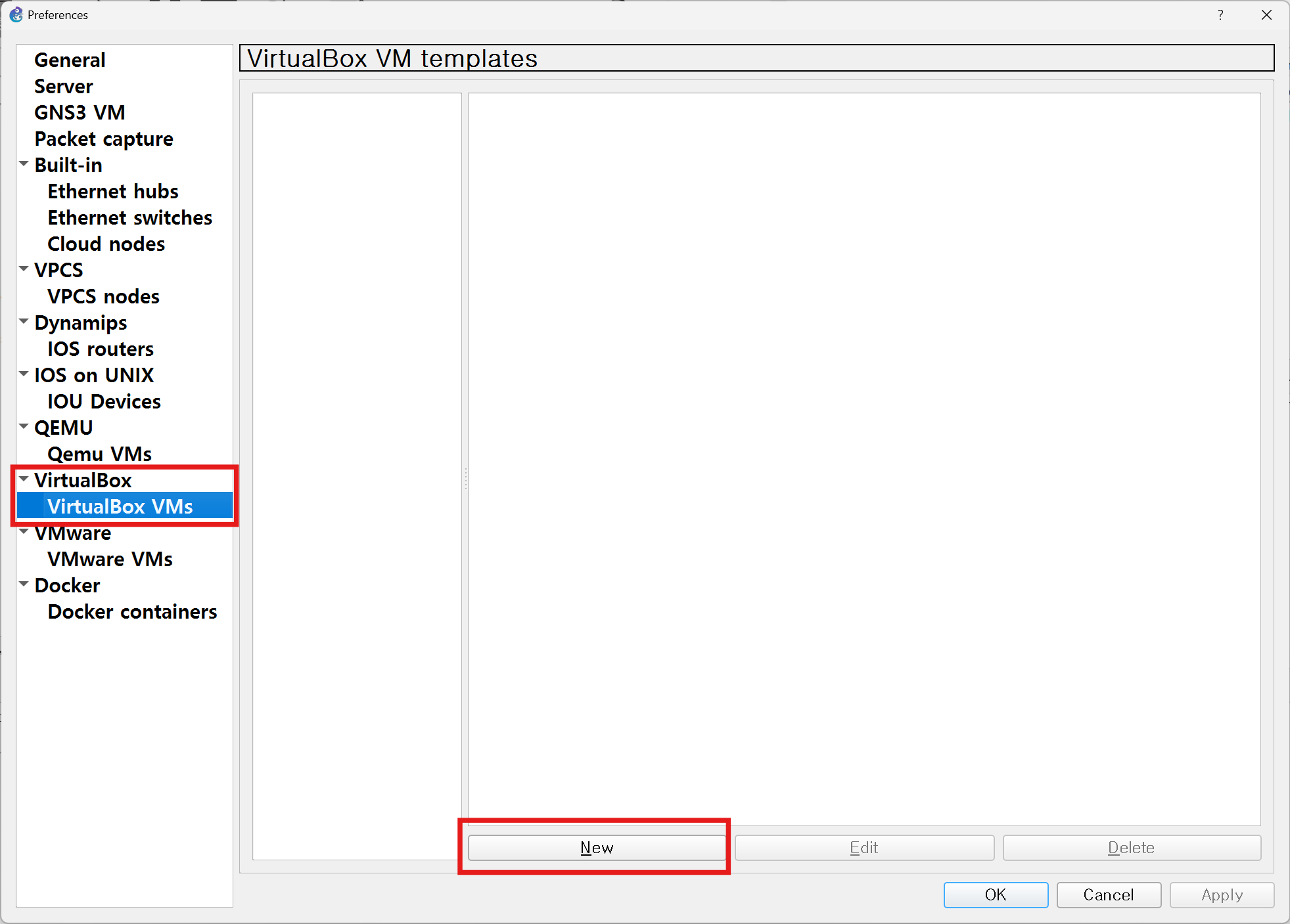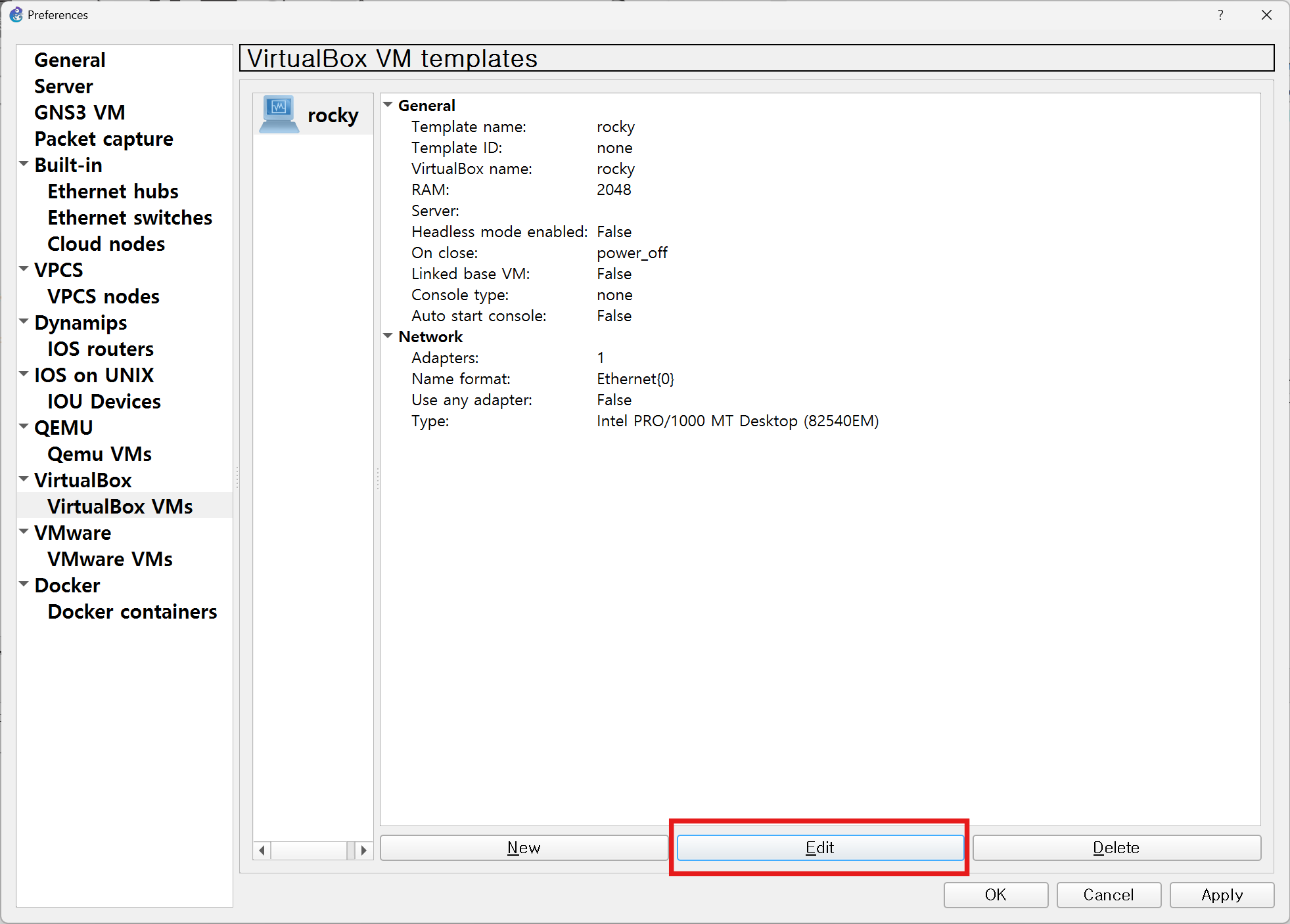 gns3에 vm을 추가하려면 반드시 확인해줘야하는 항목이 Allow GNS3 to use any configured VirtualBox adapter 항목이다 이 부분을 체크해주지않으면 네트워크 통신이 원활하게 이루어지지않게된다