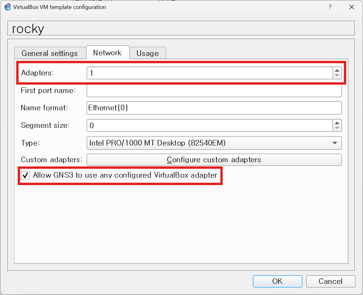 Adapters는 네트워크 NIC의 갯수를 지정할때 설정하면 된다 (기본은 1)