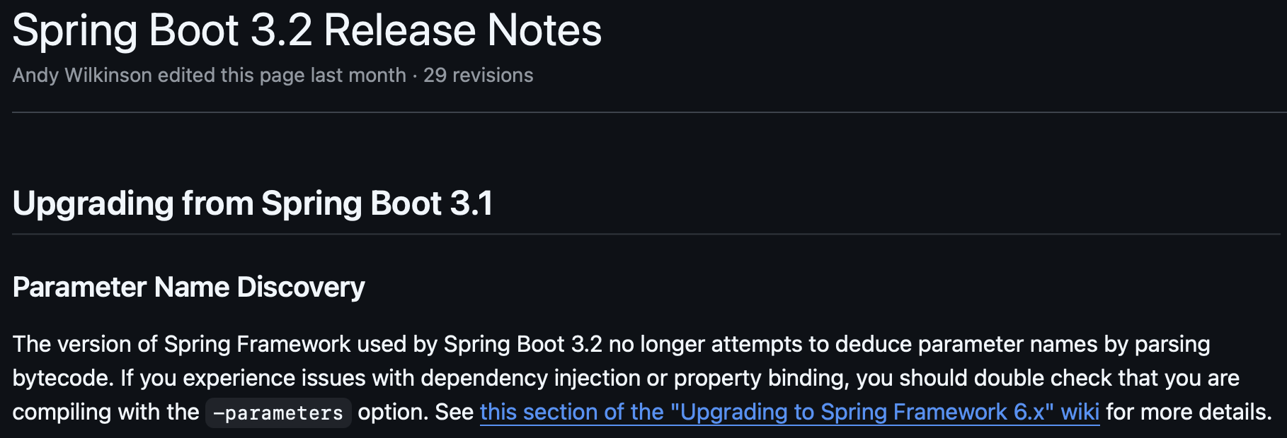 내가 지난 번에 사용한 스프링 부트는 3.1 버전이고, 이번에 사용하고 있는 건 3.3.4 버전이므로, 공식 문서에서 그 사이의 패치 노트를 열람해 봤다.