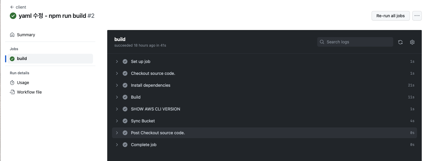 npm install 명령을 실행하여 ./my-agora-states-client-react 디렉토리에 있는 의존성을 설치한다.npm run build 명령을 실행하여 ./my-agora-states-client-react 디렉토리에 있는 클라이언트 애플리케이션을 빌드한다.- name: SHOW AWS CLI VERSION