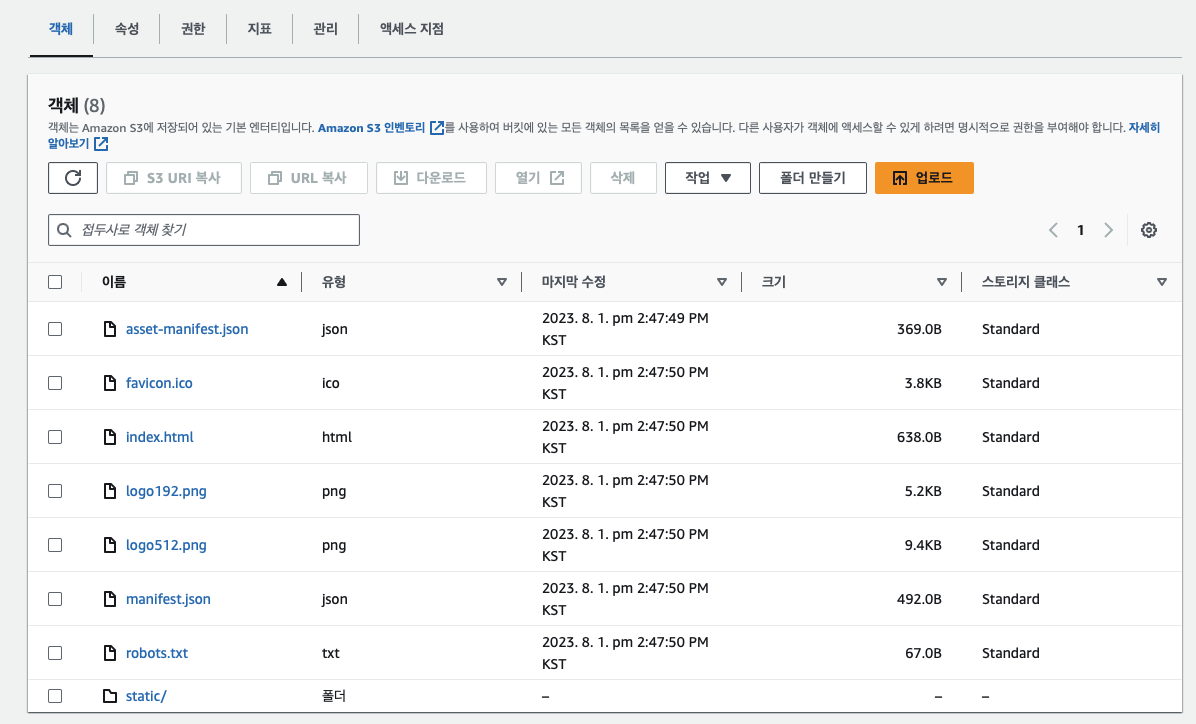 push 하면 yml에 설정한 순서대로 동작한다. 빌드 후 버킷에 업로드된다.