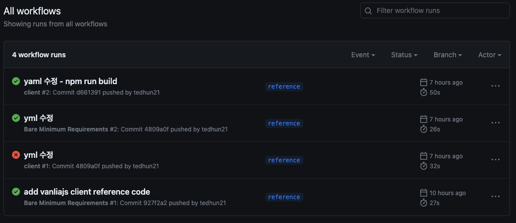 첫번째 있는 것이 실행되어 완료된 커밋이다.