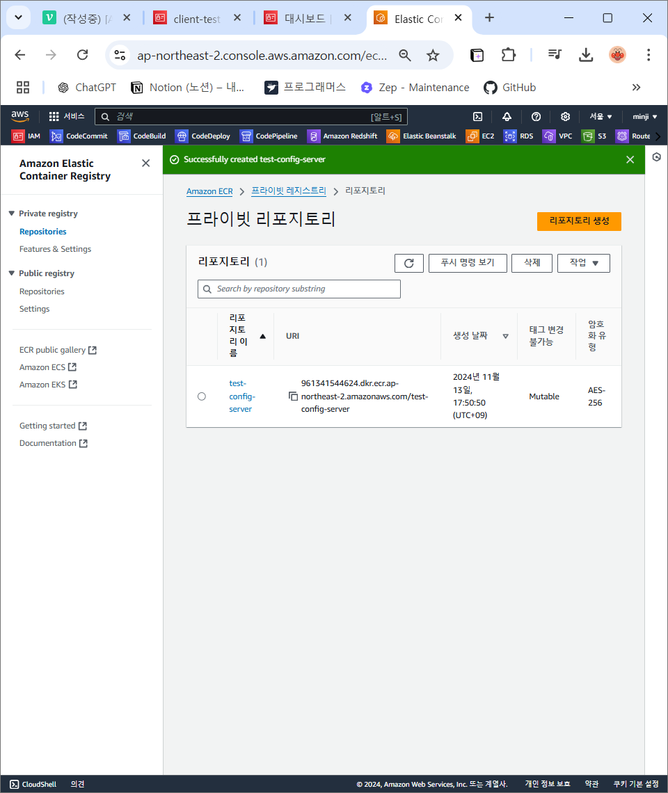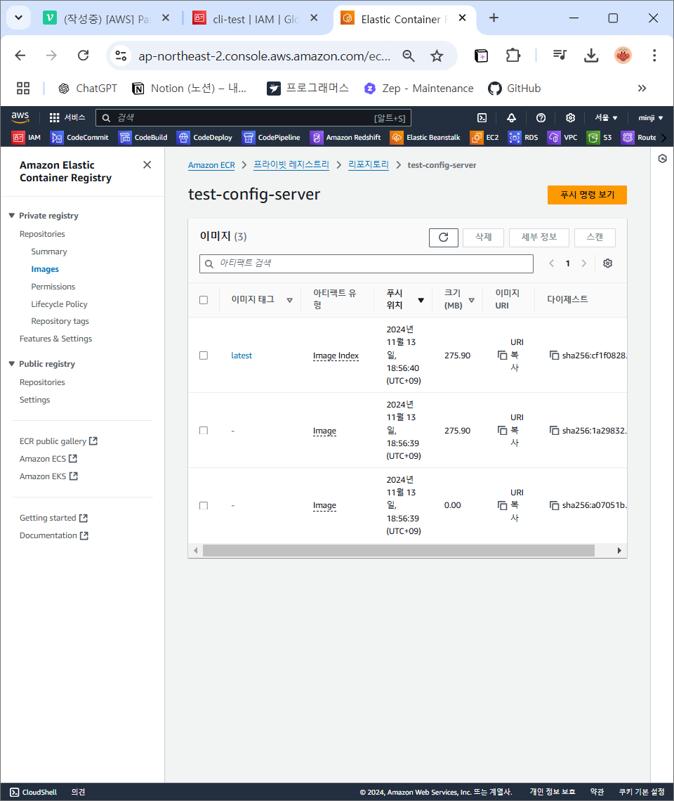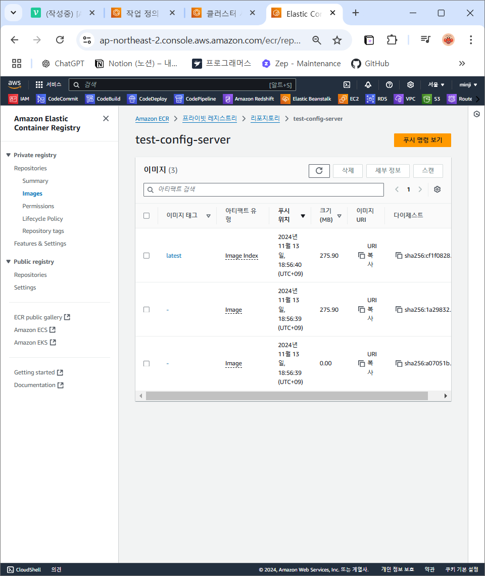 Docker 컨테이너 이미지를 안전하게 저장하고, ECS, EKS(Elastic Kubernetes Service) 등 Docker 호환 플랫폼에 쉽게 배포할 수 있는관리형 Docker 컨테이너 이미지 저장소
