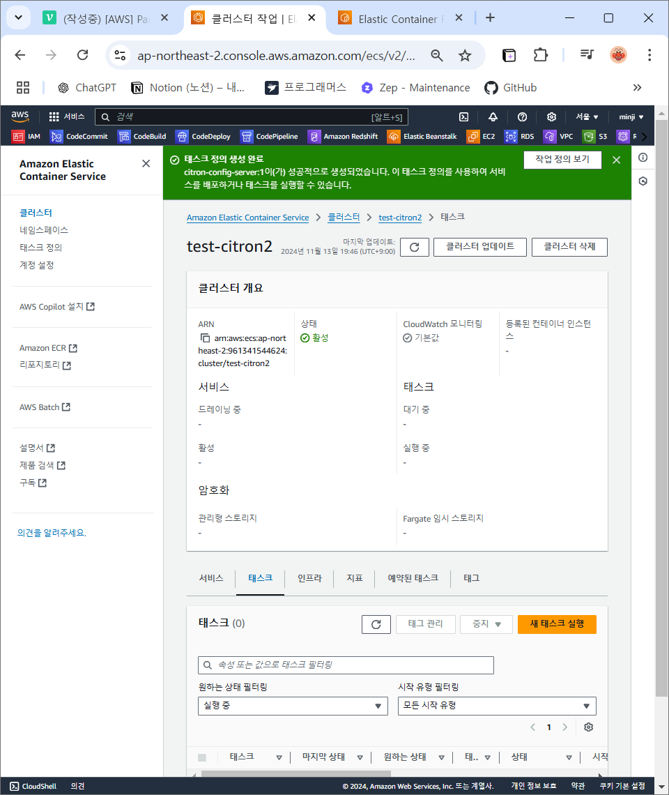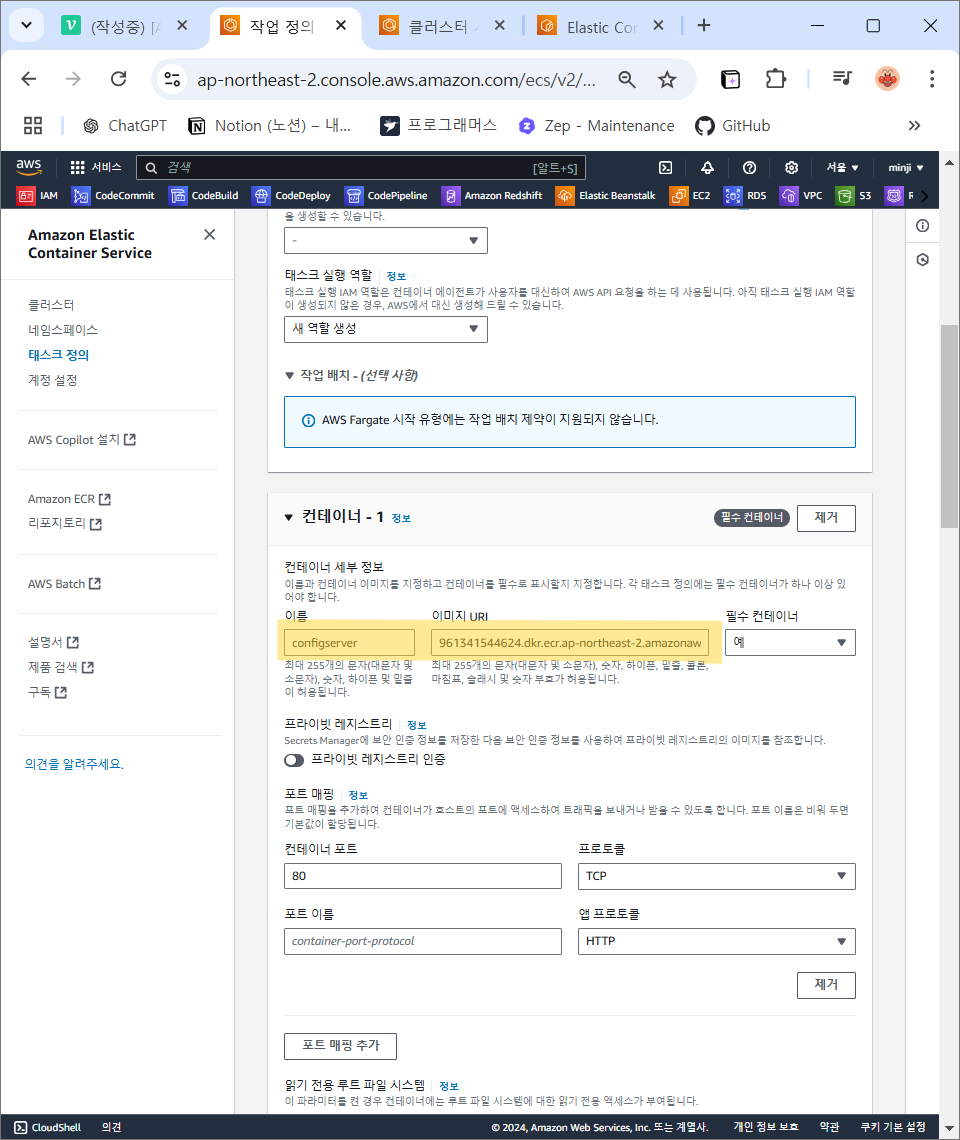 태스크 정의 (이미지 URI 복사해서 컨테이너에 붙여넣기)