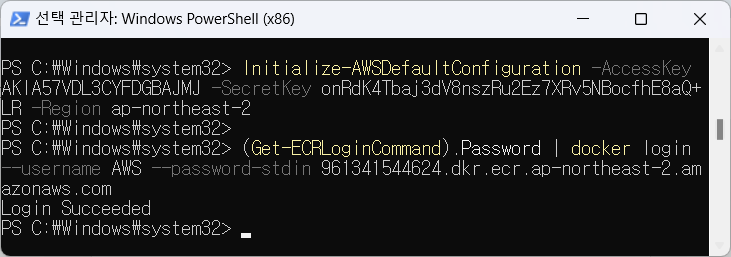Initialize-AWSDefaultConfiguration -AccessKey 액세스 키 -SecretKey 비밀 액세스 키 -Region ap-northeast-2 (Get-ECRLoginCommand).Password | docker login --username AWS --password-stdin 961341544624.dkr.ecr.ap-northeast-2.amazonaws.com