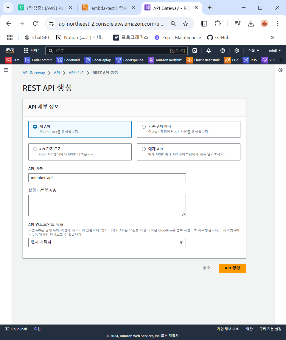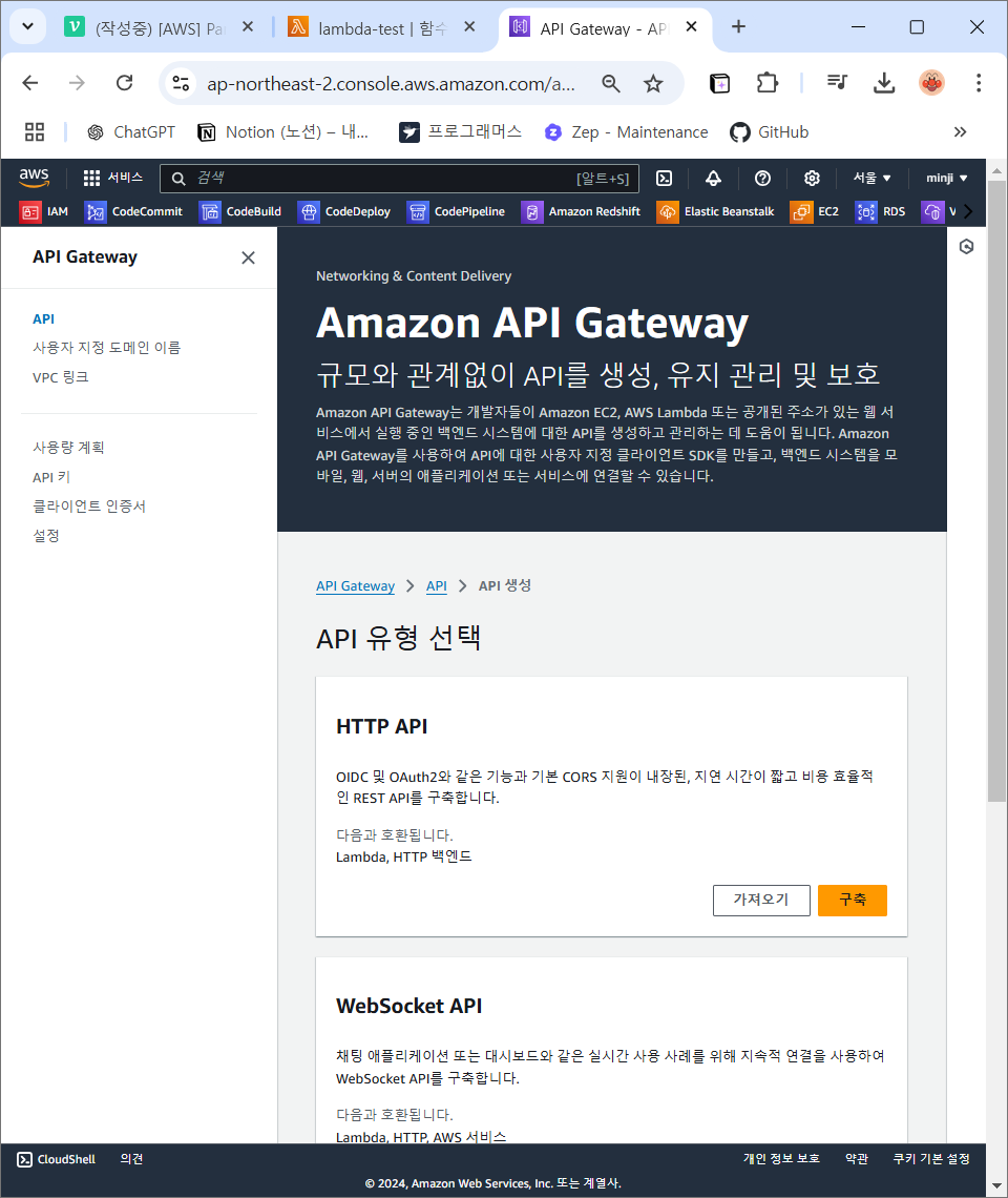 API Gateway 대시보드에서 REST API 구축 버튼 클릭