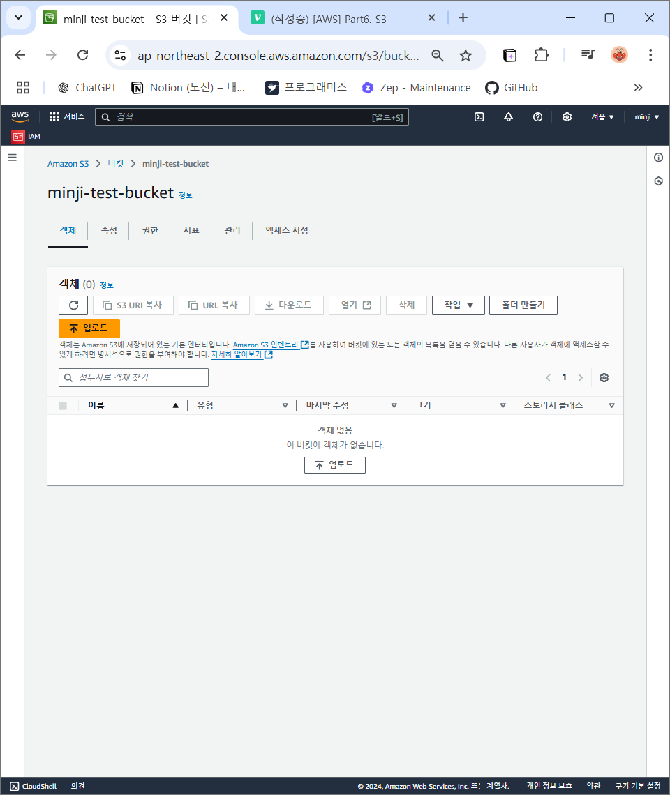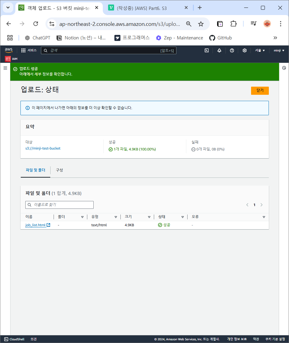 1) 버킷에 파일 업로드가 가능함(업로드 버튼 클릭 or 파일 끌어오기)