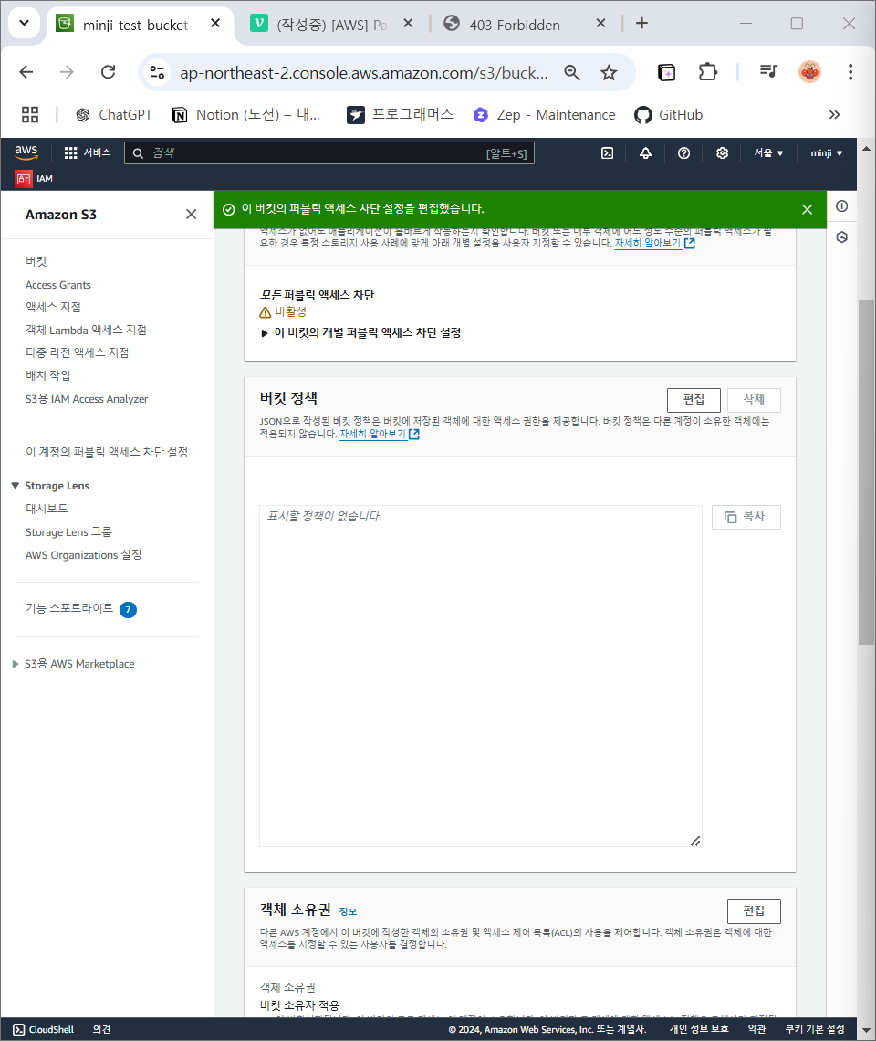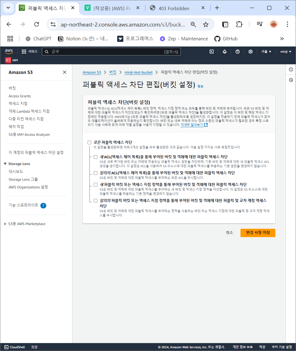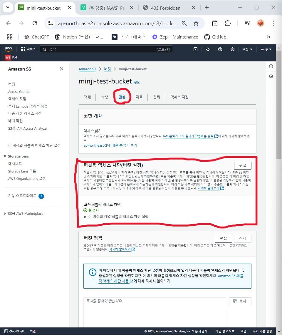 7) 다시 해당 버킷에서 권한 탭 클릭 -> 퍼블릭 액세스 차단(버킷 설정) 편집 클릭