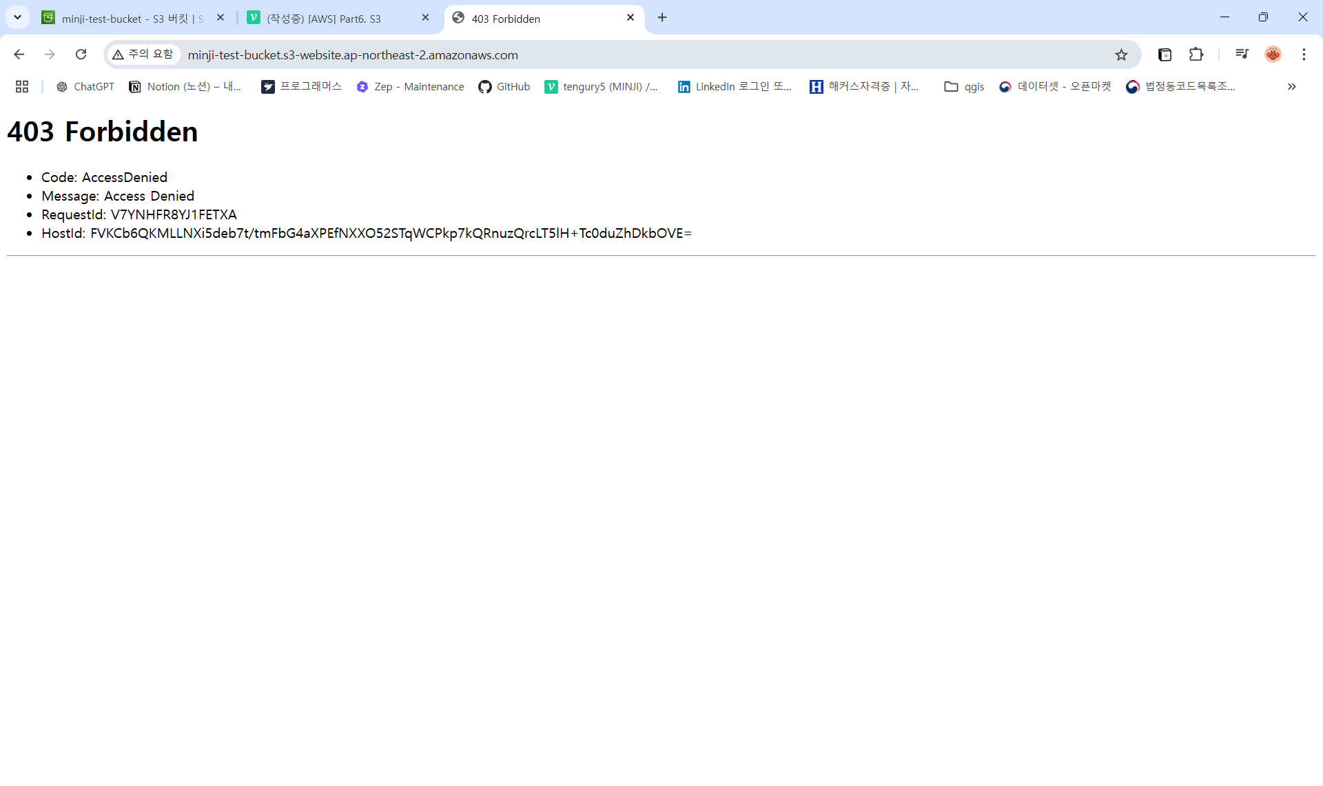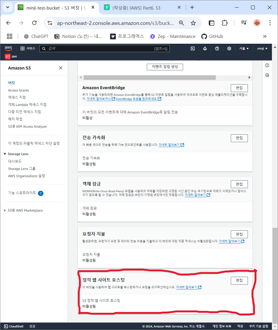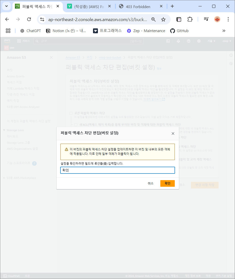 7) 다시 해당 버킷에서 권한 탭 클릭 -> 퍼블릭 액세스 차단(버킷 설정) 편집 클릭