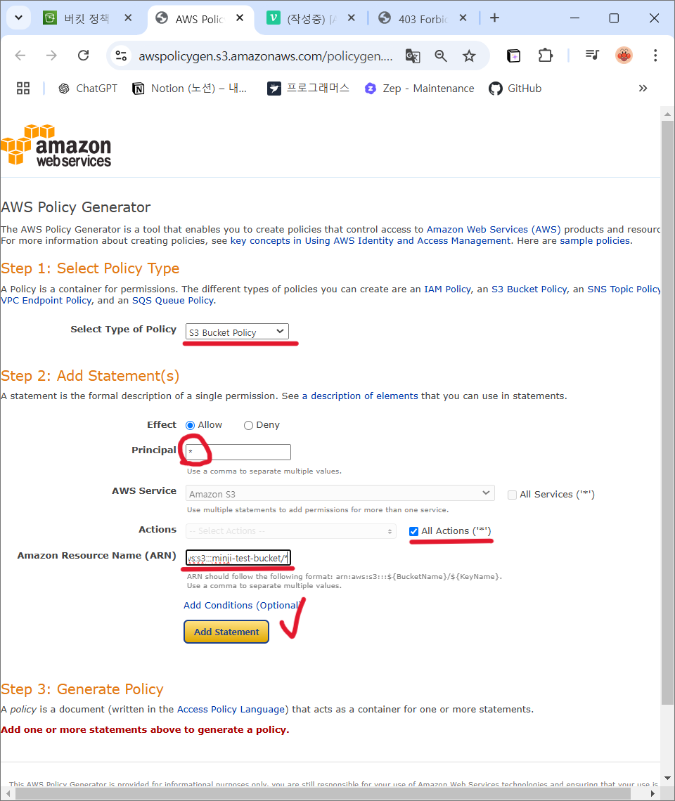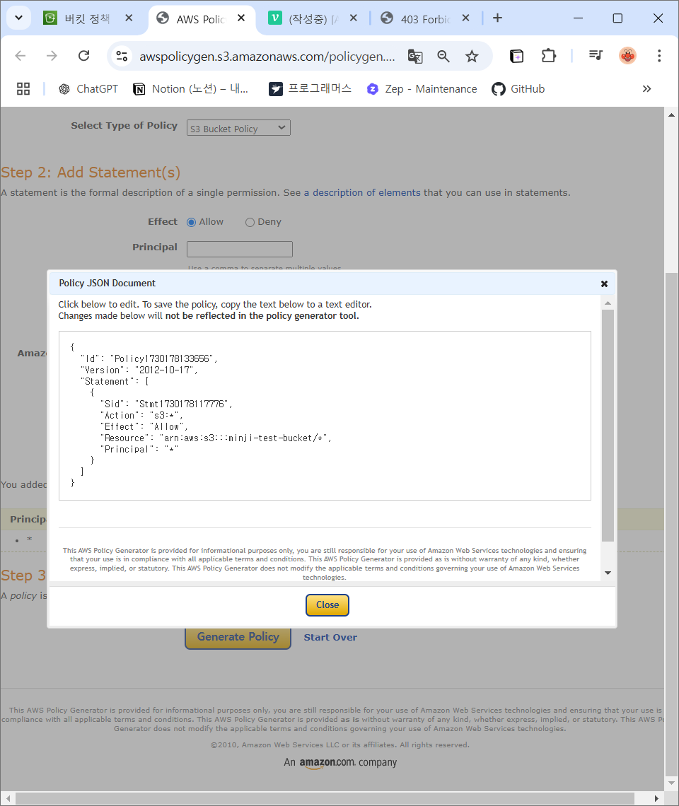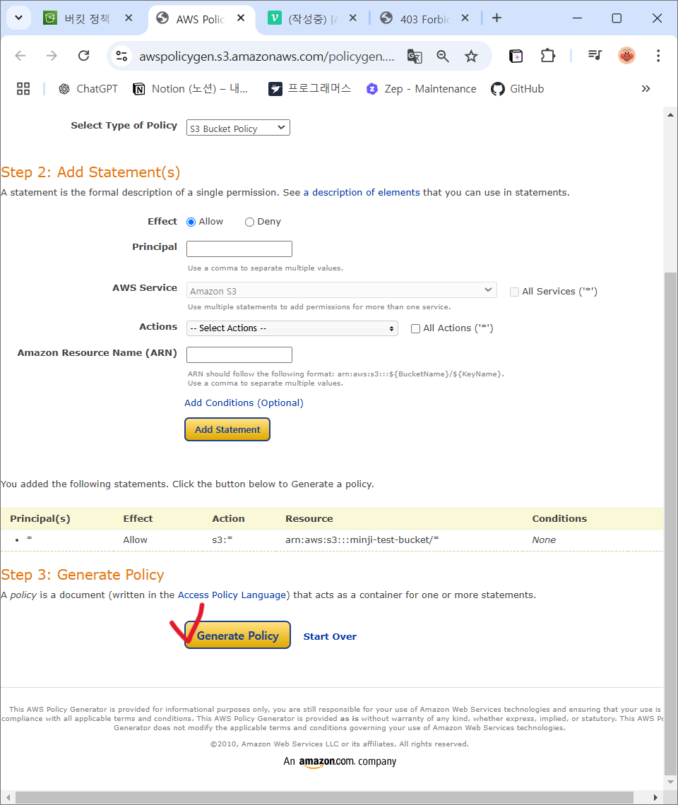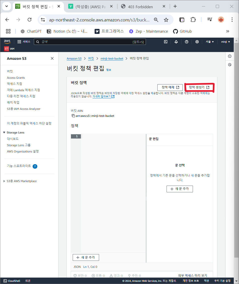 11) 정책 생성기 클릭 (JSON 형태로 매번 기억하거나 검색해서 적기 힘들기 때문)
