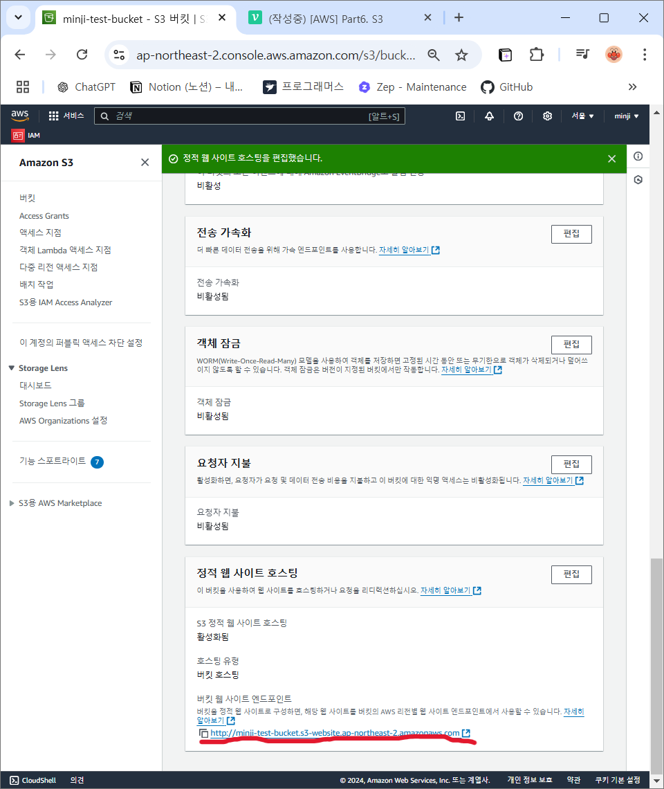 5) 버킷 웹 사이트 엔드포인트 확인 후 복사