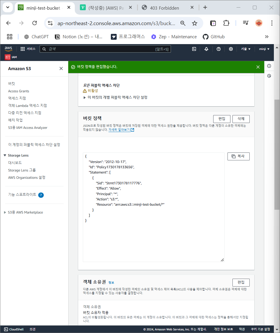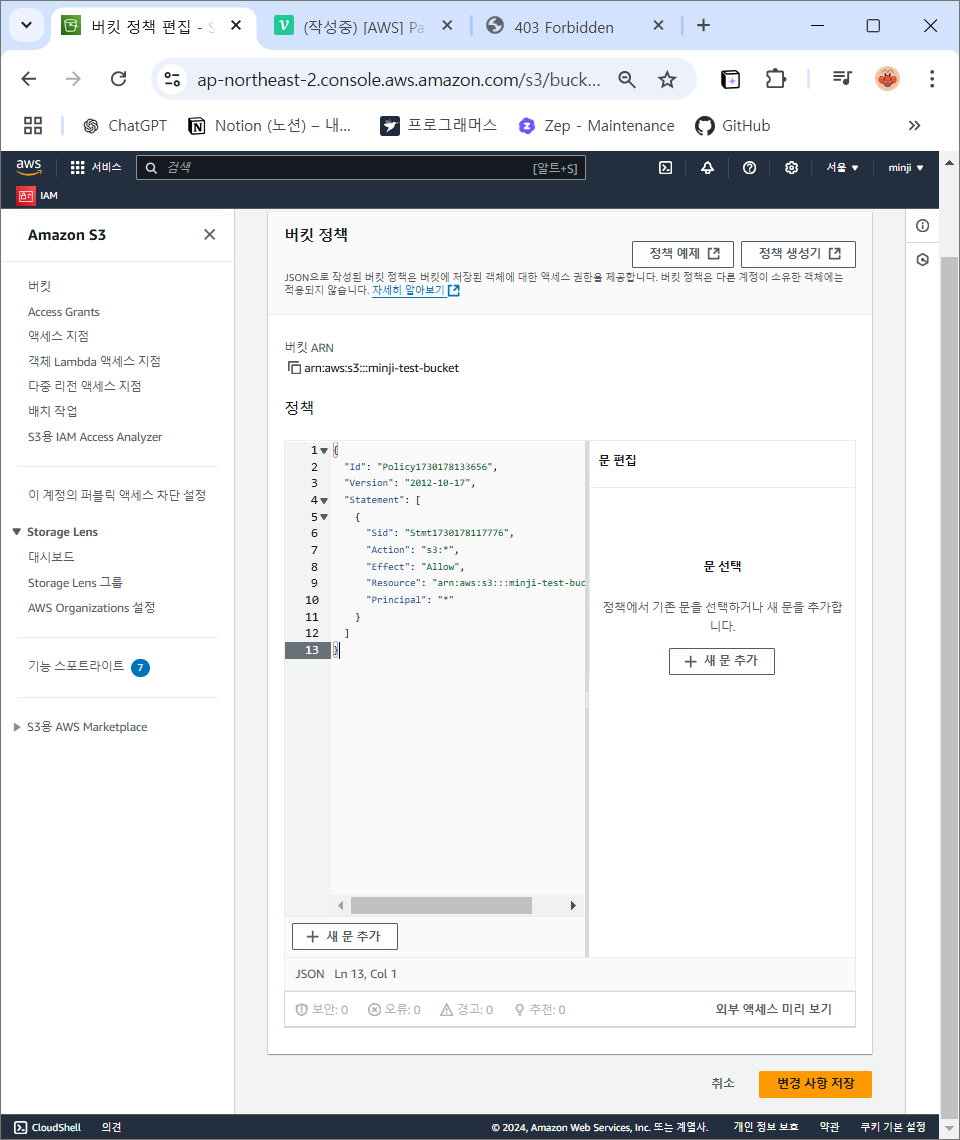 14) 버킷 정책에 붙여넣기 후 변경 사항 저장 클릭
