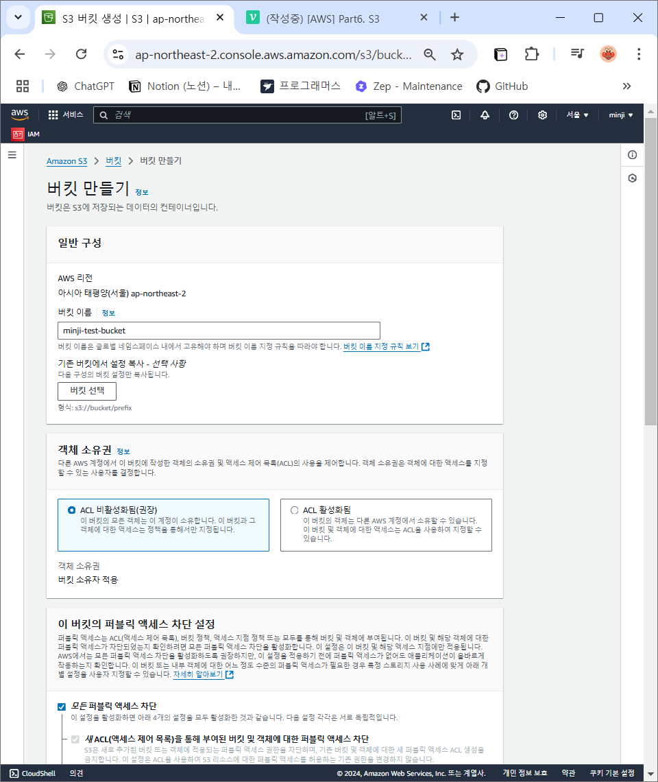 2) 버킷 이름 입력, 퍼블릭 액세스 차단