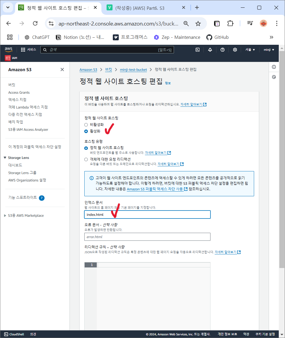4) 비활성화 -> 활성화 선택 -> 인덱스 문서(index.html) 지정 -> 변경사항 저장 클릭