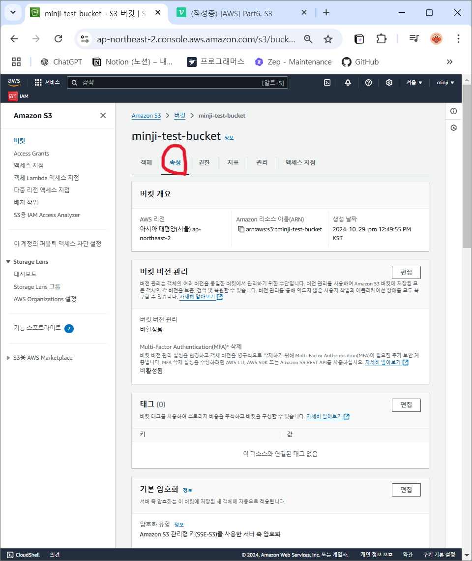 2) S3 대시보드에서 버킷 클릭 -> 정책설정하고자 하는 버킷명 클릭하여 속성 탭 클릭