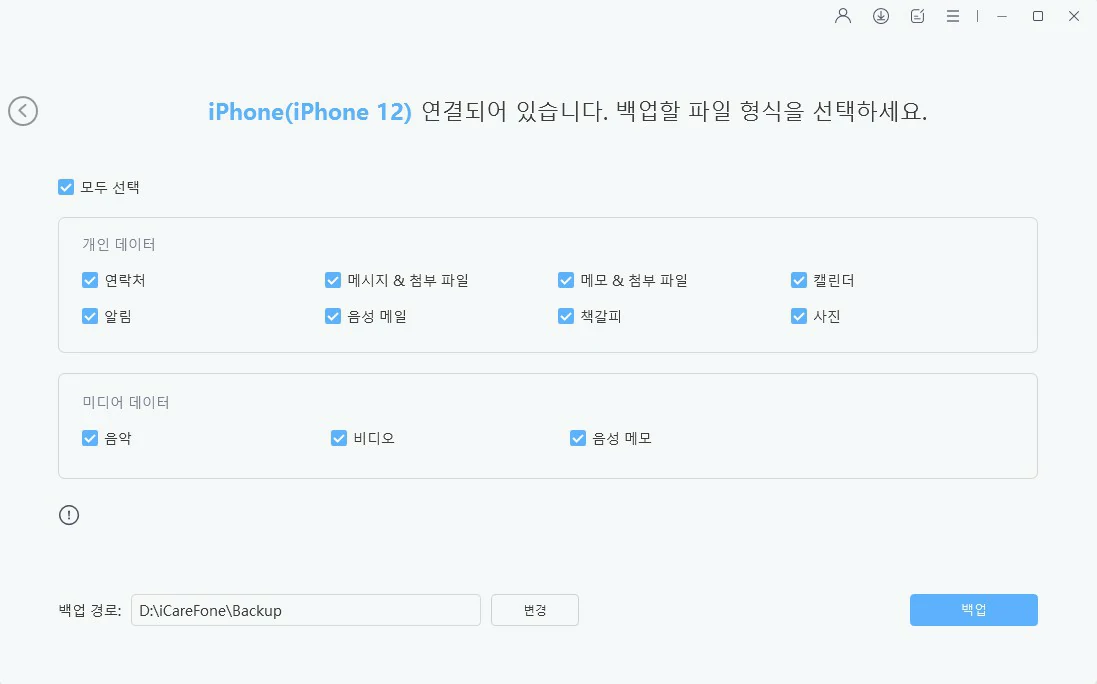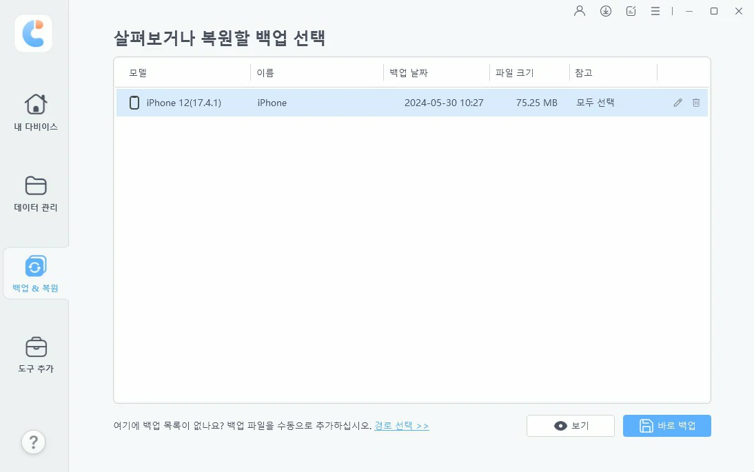 | Tenorshare iCareFone | 선택적 백업/복원 가능, 데이터 손실 거의 없음, 속도 빠름 | 프로그램 설치 필요, 무료 버전 제한 |