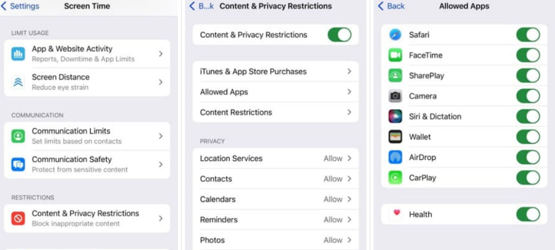 의외로 자주 발견되는 원인입니다. 스크린 타임 제한이 켜져 있으면 CarPlay가 작동하지 않을 수 있습니다.