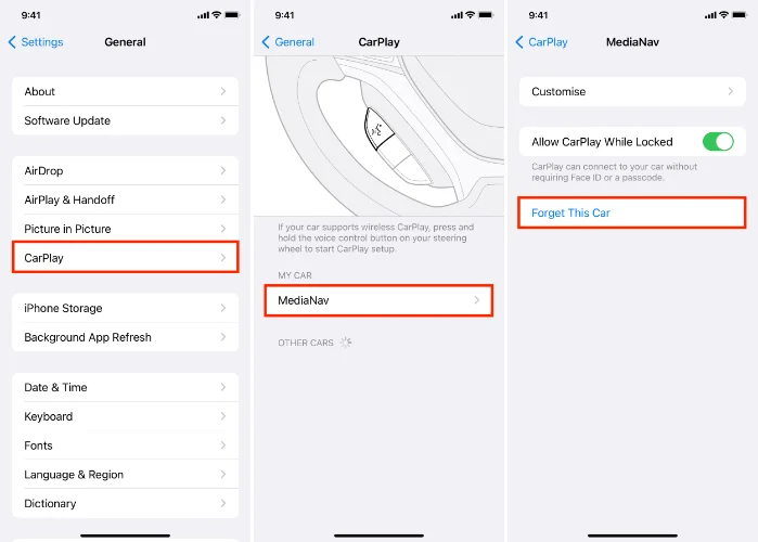 2. “설정” → “일반” → “CarPlay”에서 차량을 선택하고 안내 메시지에 따라 연결합니다.