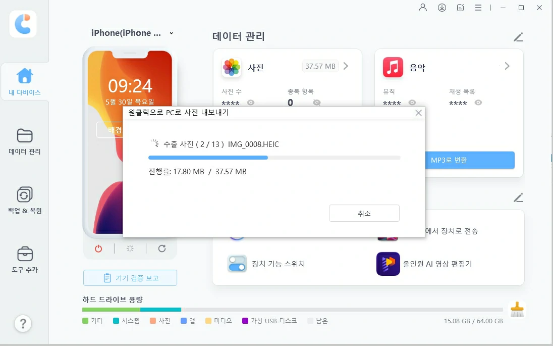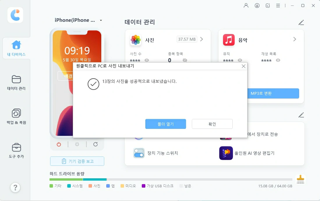 원클릭 전송: iTunes나 클라우드 제약 없이 PC나 다른 기기로 바로 이동