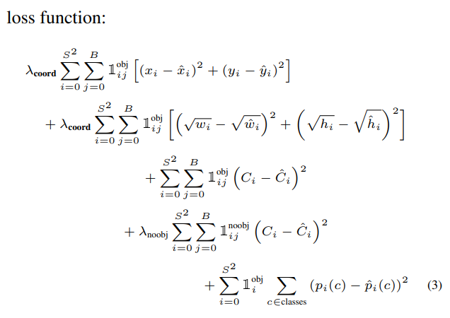 sum-squared error를 사용하는 YOLO의 최종 손실함수는 그림과 같다