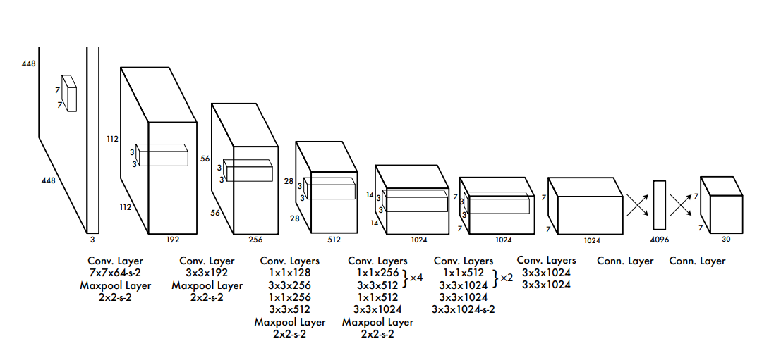 YOLO의 구조는 그림과 같이 24 CNN layer와 2 fc layer로 구성되어있다