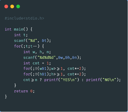w * h 사이즈의 종이를 규칙에 맞게 최대로 나눌 때, 그 조각이 n개 이상이면 YES, 미만이면 NO 출력