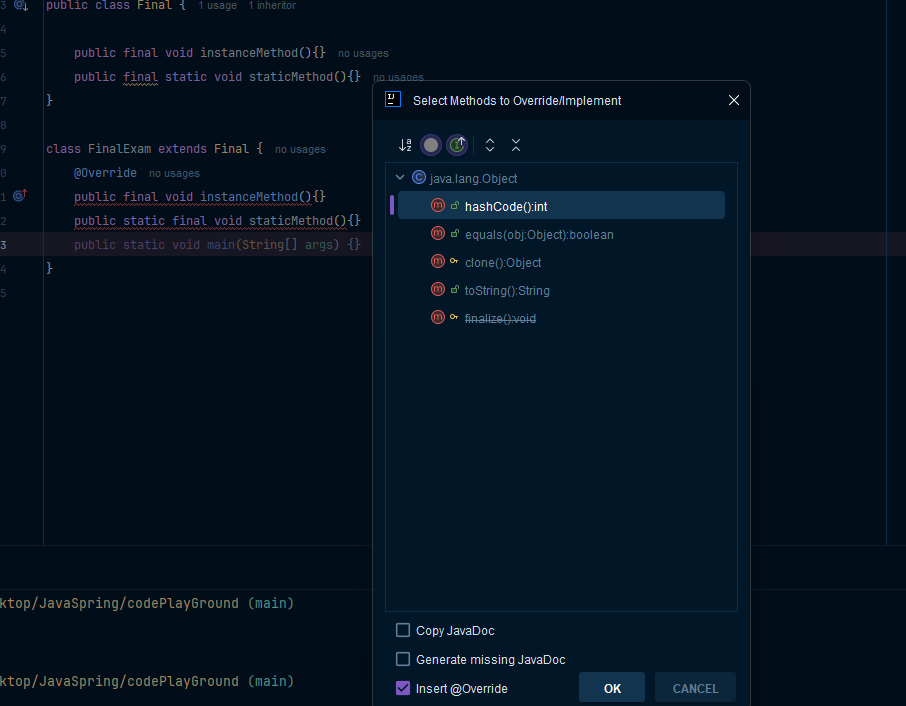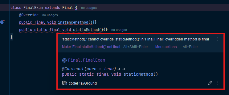 - static 메서드는 어차피 오버라이딩이 안되기때문에 별 의미가없다